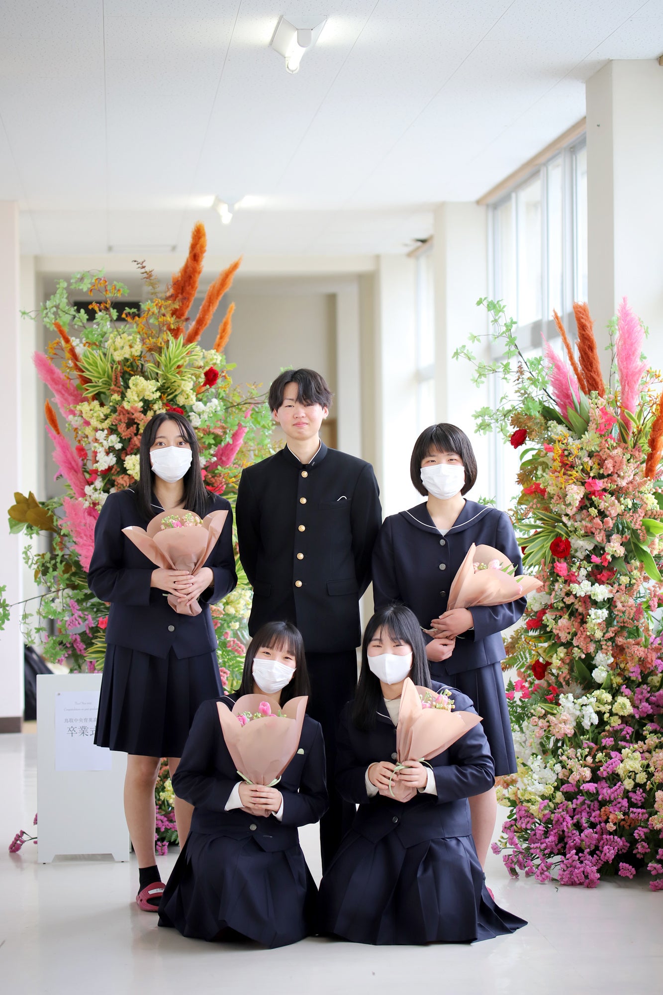 コロナと隣りあわせの学生生活を過ごした生徒たちに向けて、春からの新生活で自分らしく咲いてほしいとの想いから企画されたこの取り組み。思い出のつまった学校の中に、町内の花を使用して制作した「卒業式フラワーフォトブース」を設置し、お世話になった先生や、家族、友達同士で記念写真を撮影頂けます。