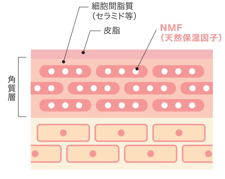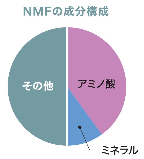 肌のうるおいに欠かせない保湿因子の一つ「NMF(天然保湿因子)」は、アミノ酸やミネラル等で構成されており、角質層の中で水分保持やバリア機能を担う大切な成分です。