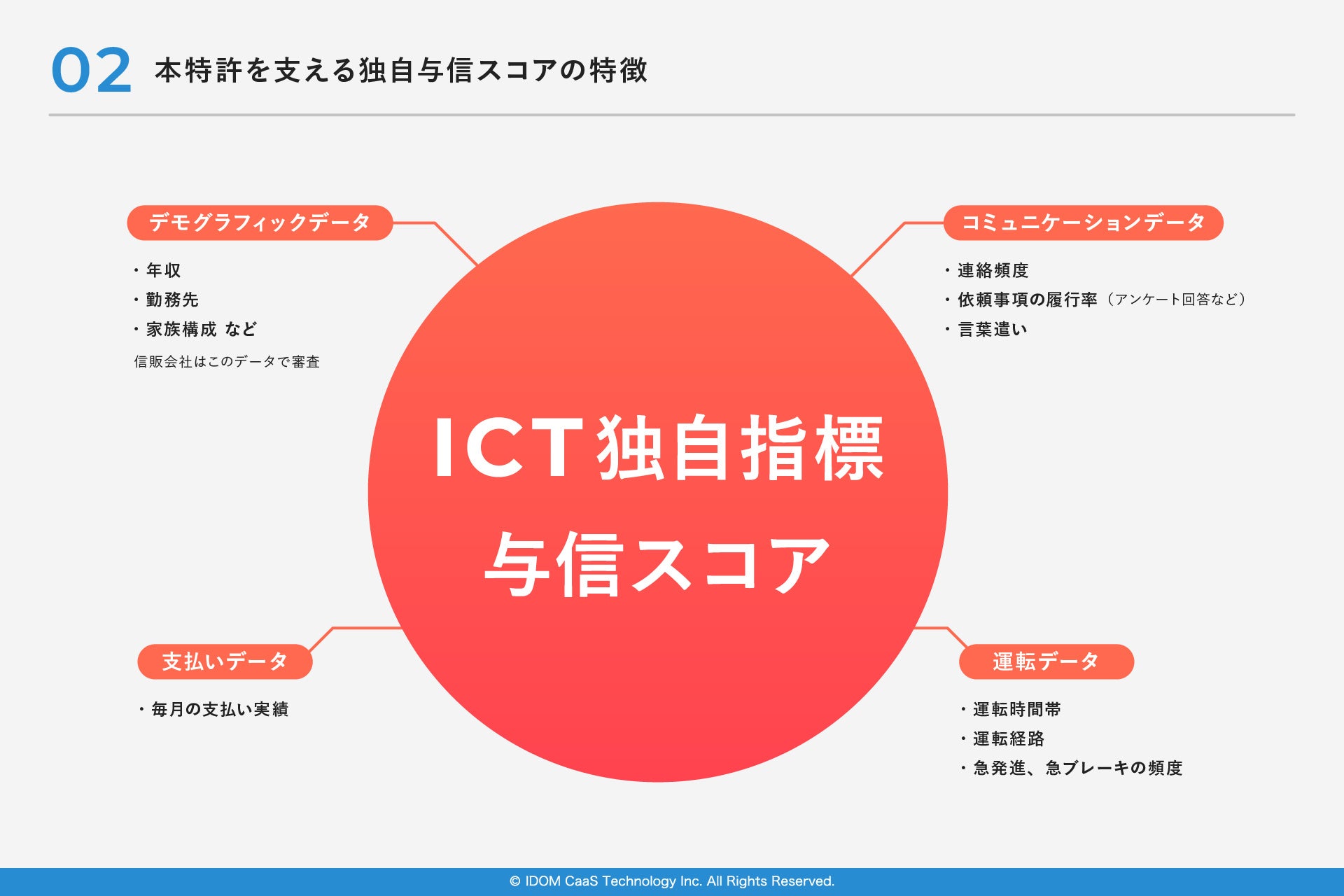 ICTではより多くの⽅に豊かなマイカーライフを送っていただくために、そういった⽅々を「データ」から⾒つけ出して、⾦融市場へのアクセスを後押ししたいという想いから、信販会社の審査に通らない⽅でもマイカーに乗れる独⾃の⾞両提供フローを構築し、特許の出願に⾄りました。