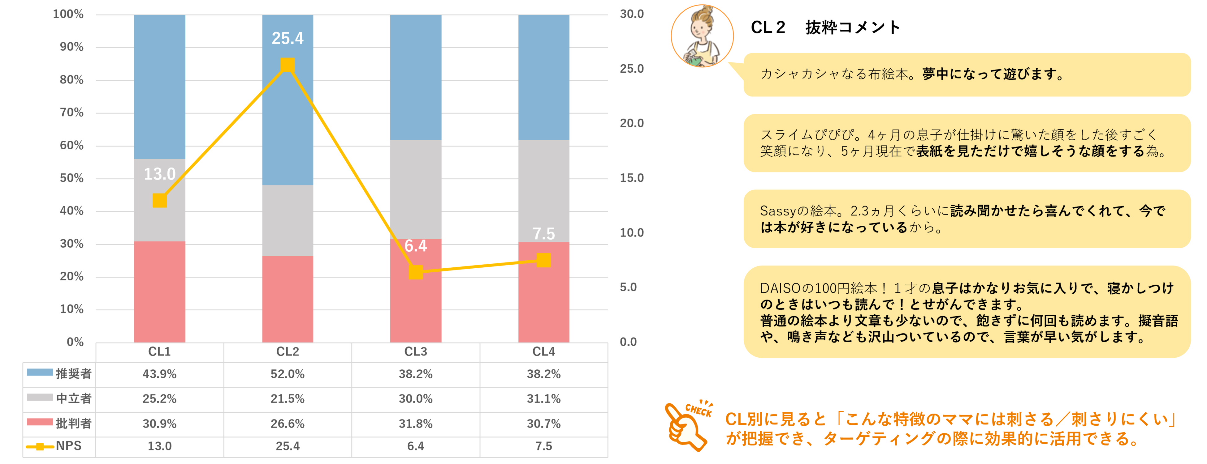 クラスター(CL)2が突出して推奨度が高いことが分かりました。このようにママをタイプ別に見ることで、商品・サービス開発の際、ターゲット・ペルソナ設定が容易になります。