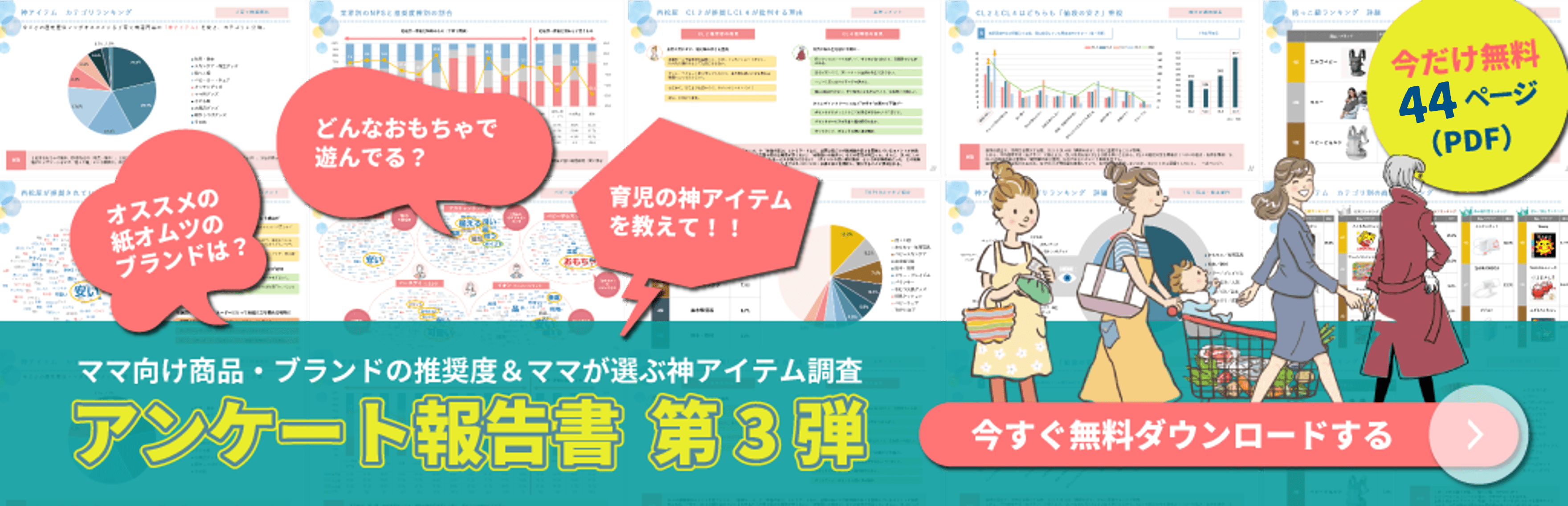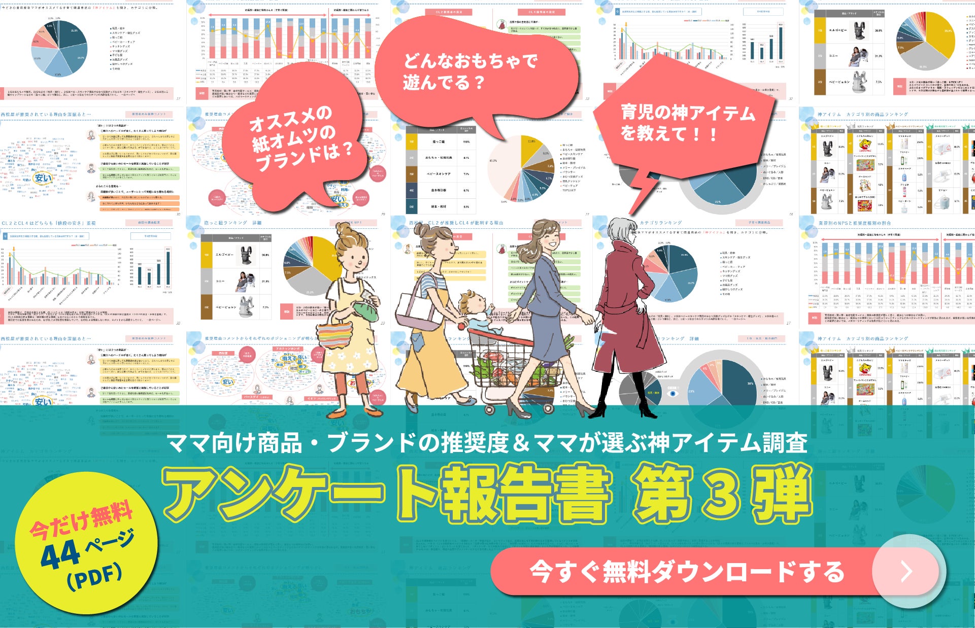 子育て関連商品・ブランドの推奨度およびママが選ぶ"神アイテム"ランキングをまとめたレポートを無償で公開しております。ぜひ下記リンクよりダウンロードの上ご覧ください。