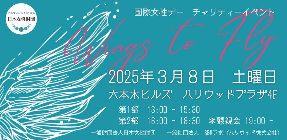 一般財団法人 日本女性財団(本社:東京都千代田区⼤⼿町、代表理事:対⾺ルリ⼦)と一般社団法人 SBMラボは(本社:東京都港区六本木、代表理事:山名群)は、3月8日(土)の国際女性デーに、「Wings to Fly “ウェルビーイングという翼で世界を変える”」と題した二部制のチャリティーイベントを開催いたします。