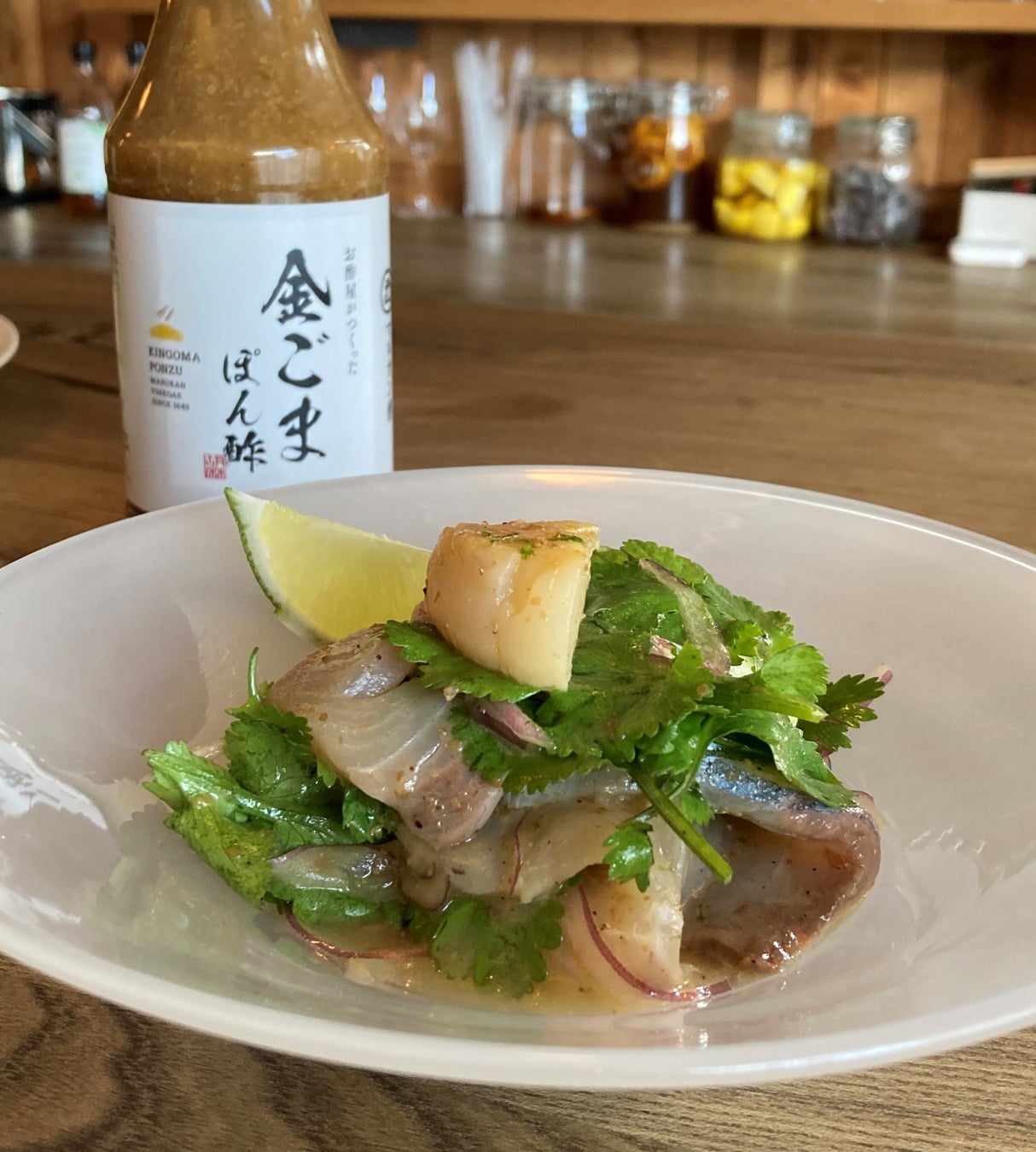 帆立と鮮魚、ズッキーニのセビーチェ 金胡麻ぽん酢仕立て