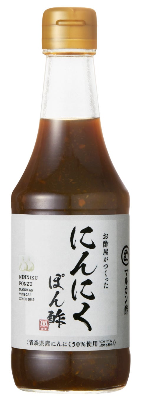 主に青森県産のにんにく使用し、ペースト状と大きめにカットしたにんにくを混ぜて、ガツンとしたインパクトのある風味をお楽しみいただける一品。隠し味にレモン酢を配合し、柚子と柚香(ゆこう)の2種類の柑橘果汁を使用することで、爽やかな酸味を加え、さっぱりとした後味が印象的なぽん酢。香川県小豆島産の濃口醤油に、かつおと昆布を用いて旨みを加え、様々な料理との相性が抜群です。