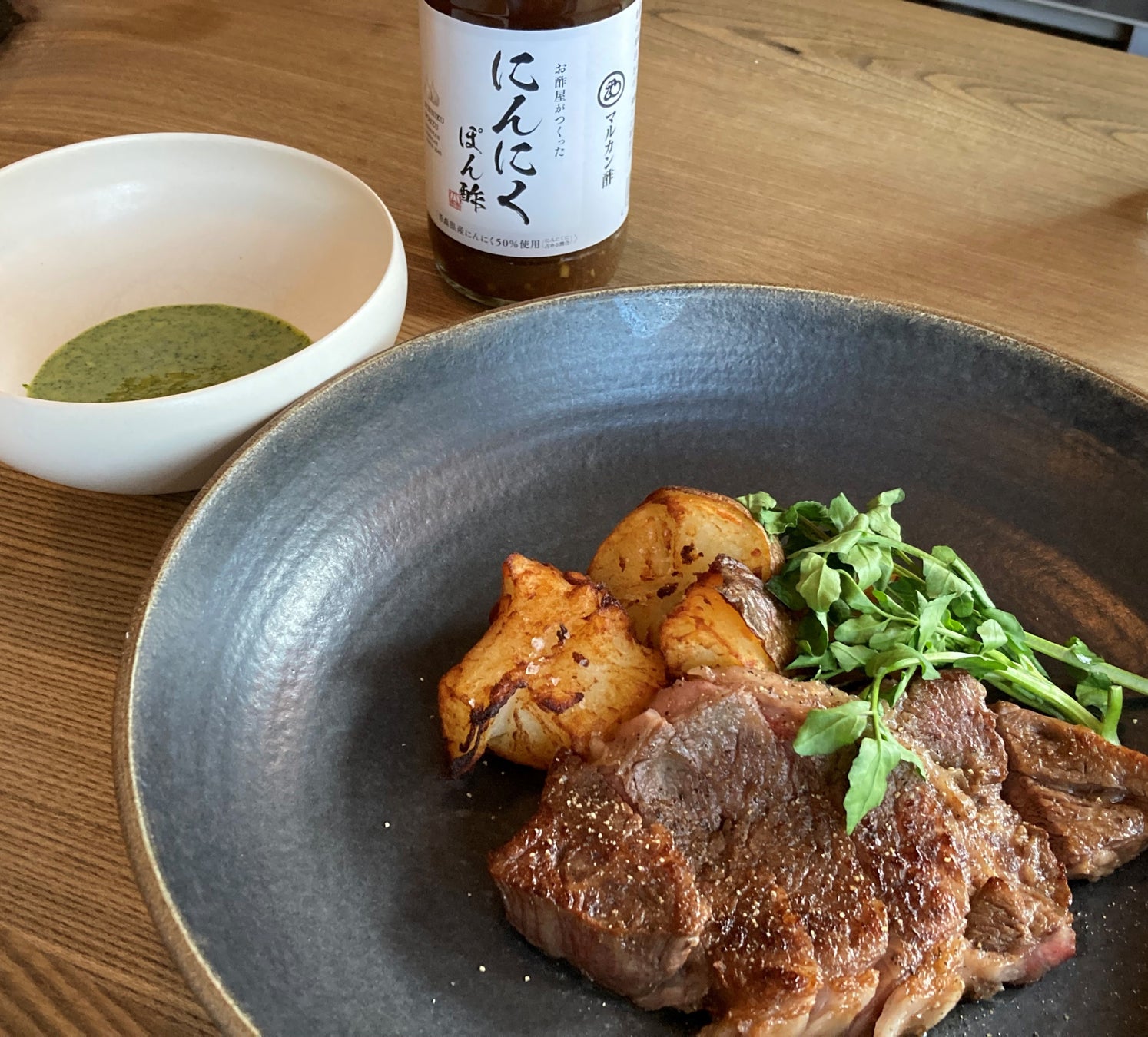 程よく脂のある赤身肉を炭火で香ばしく焼き上げ、 「お酢屋がつくった にんにくぽん酢」にハーブを加えた爽やかな香りの広がるソースを合わせた一品。