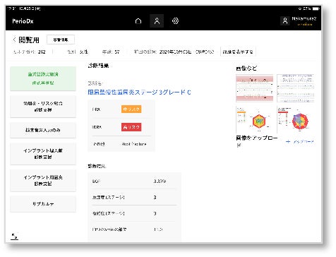 「PerioDx」が対象としたのは日本歯周病学会から発行された「歯周病の新分類への対応」(※)に基づく歯周病診断(以下、新分類診断)です。新分類診断は、患者一人一人に合わせた治療を可能にし、リスクや長期的な予後の予測も可能になるなど、より適切で効果的な歯周治療を可能にするとされていますが、反面、非常に複雑かつ煩雑で診断に時間がかかるため、実際の臨床で活用するのが極めて難しい状況にありました。その課題を解決するために開発したのが、「PerioDx」の歯周病診断支援機能です。口腔内の状態、歯周検査結果、いくつかの問診内容を入力するだけで自動的にステージ・グレードなどの結果・コメントが表示され、歯科医師が承認すれば診断結果が確定でき、新分類診断に慣れた歯科医師でも通常20分以上かかるところ、わずか8分程度で診断できるようになります。くわえて、診断結果はデータ出力可能で、患者とのコミュニケーション・動機付けツールとして活用できることも特徴です。