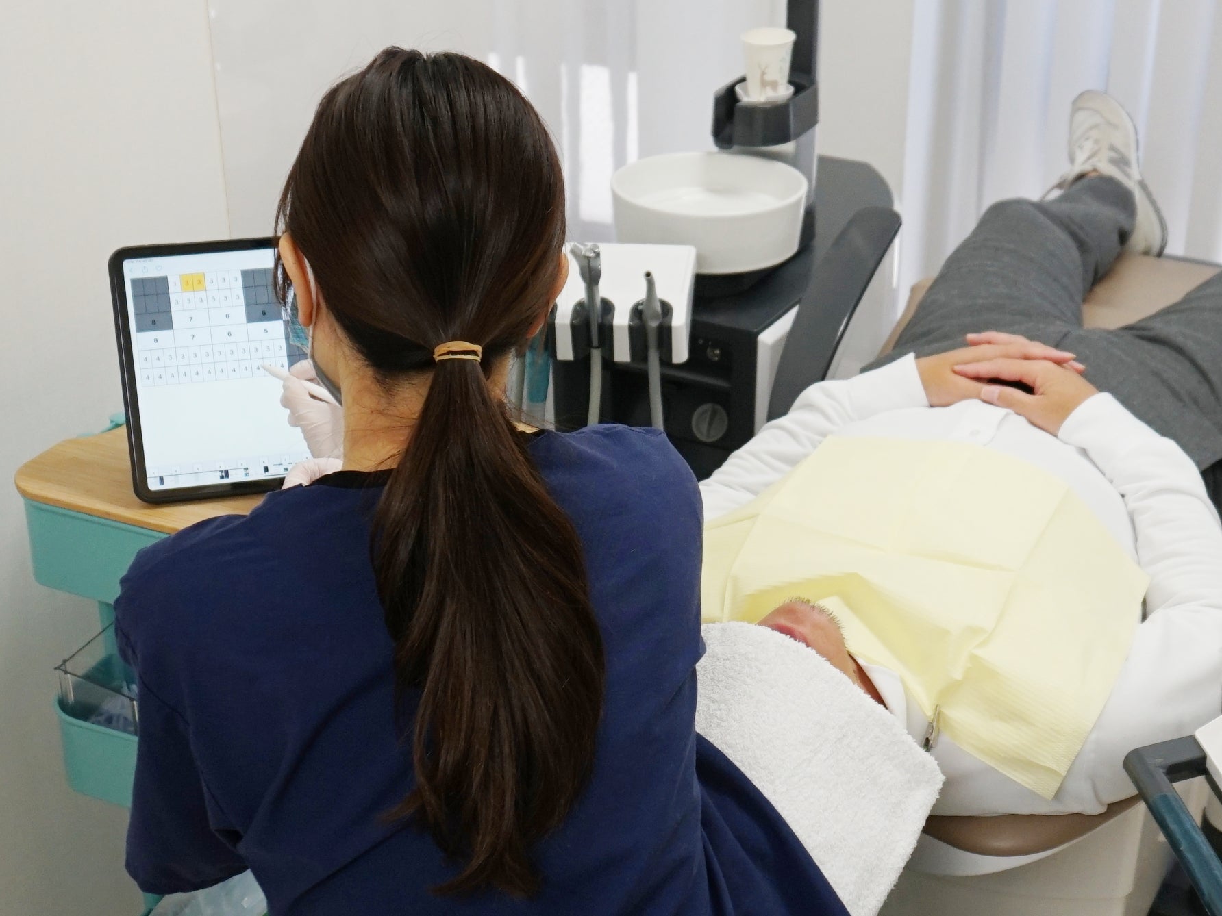 それら既存システムの課題を解決したのが「PerioDx」のマイクなしハンズフリー歯周検査入力機能です。独自のAI言語モデルにより、専用マイクを使わなくても検査時の専門用語を精度高く音声認識できるハンズフリー入力を実現しました。これにより、人的・費用的負担をおさえ、スタッフ1人で清潔性とスピードを保った歯周検査が可能となります。