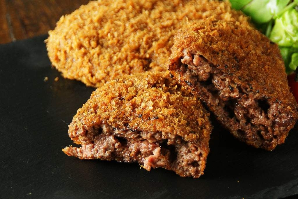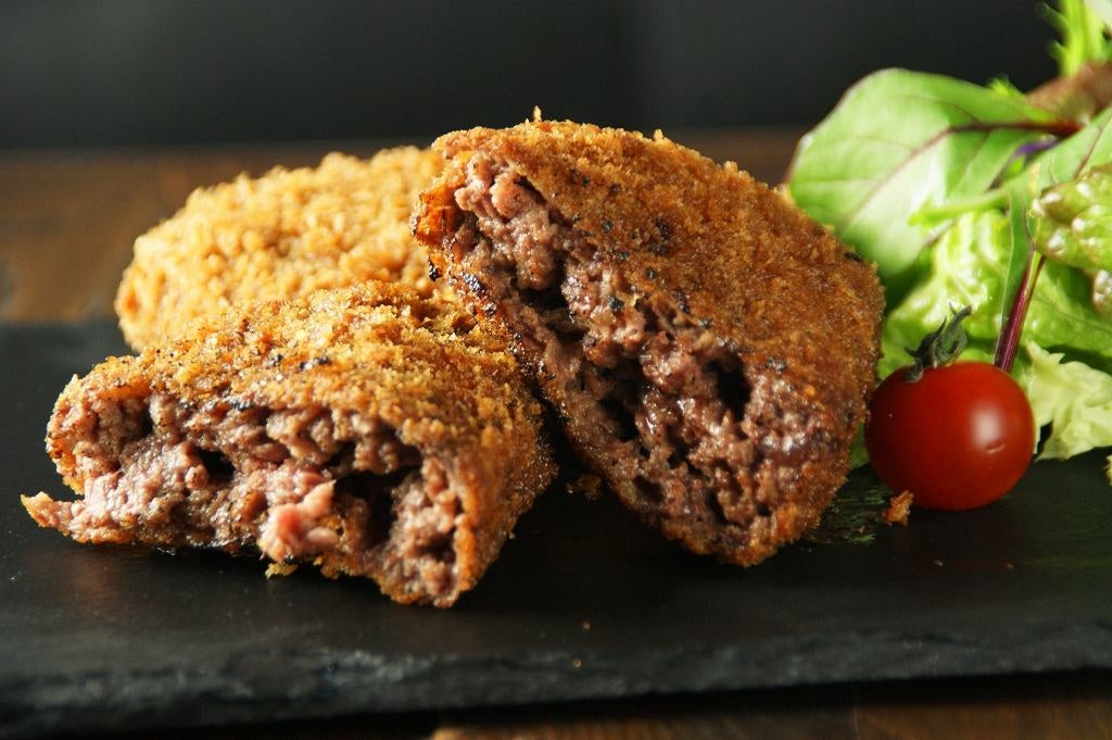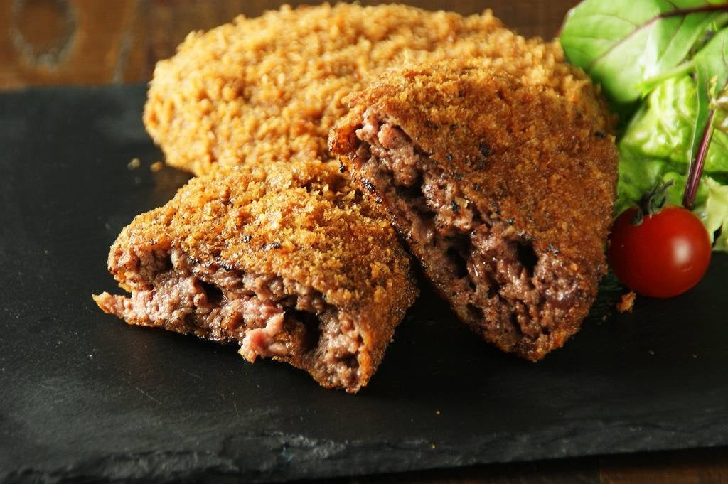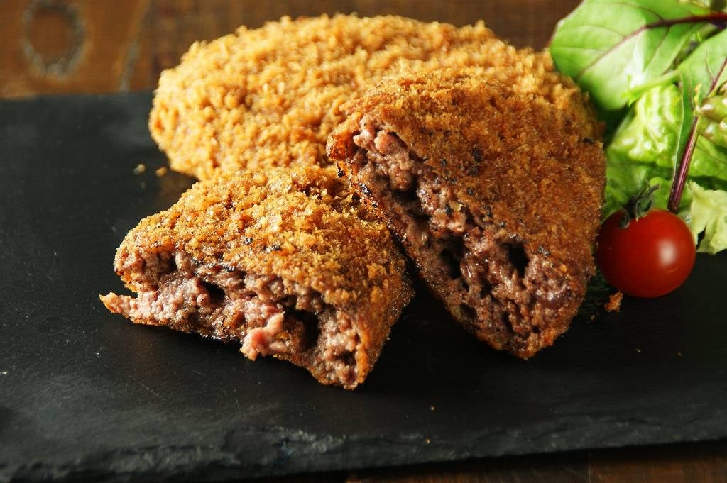 挽肉は鮮度が大切!自家挽きの新鮮挽肉を使用したハンバーグ専門店が作るメンチカツの登場です。国産牛と和牛を自家挽きし、こだわりの比率で肉肉しく仕上げたメンチカツ。和牛の旨みが口にひろがる贅沢メンチカツを冷凍でお届けします。ソースだけでなく、塩をふっても和牛の甘みが増して美味しくお召し上がりいただけます。