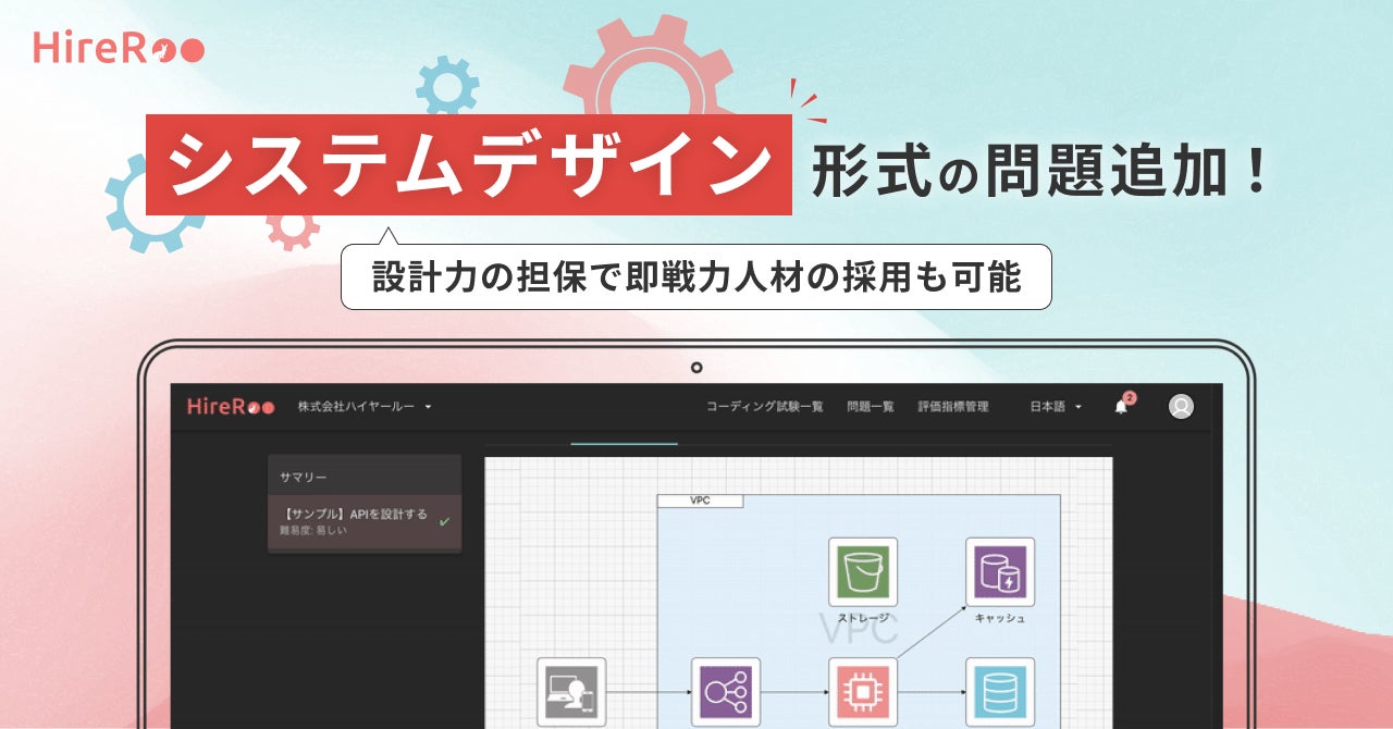 株式会社ハイヤールー(本社:東京都渋谷区、代表取締役:葛岡宏祐)は、コーディング試験サービス『HireRoo(ハイヤールー)』(https://hireroo.io)にて新たにシステムデザイン形式の問題をリリースしました。コーディング力に加えてシステム設計力の評価が可能となり、即戦力人材の採用にも本サービスを活用できるようになります。お問い合わせはこちらから。(https://hireroo.io/contact)