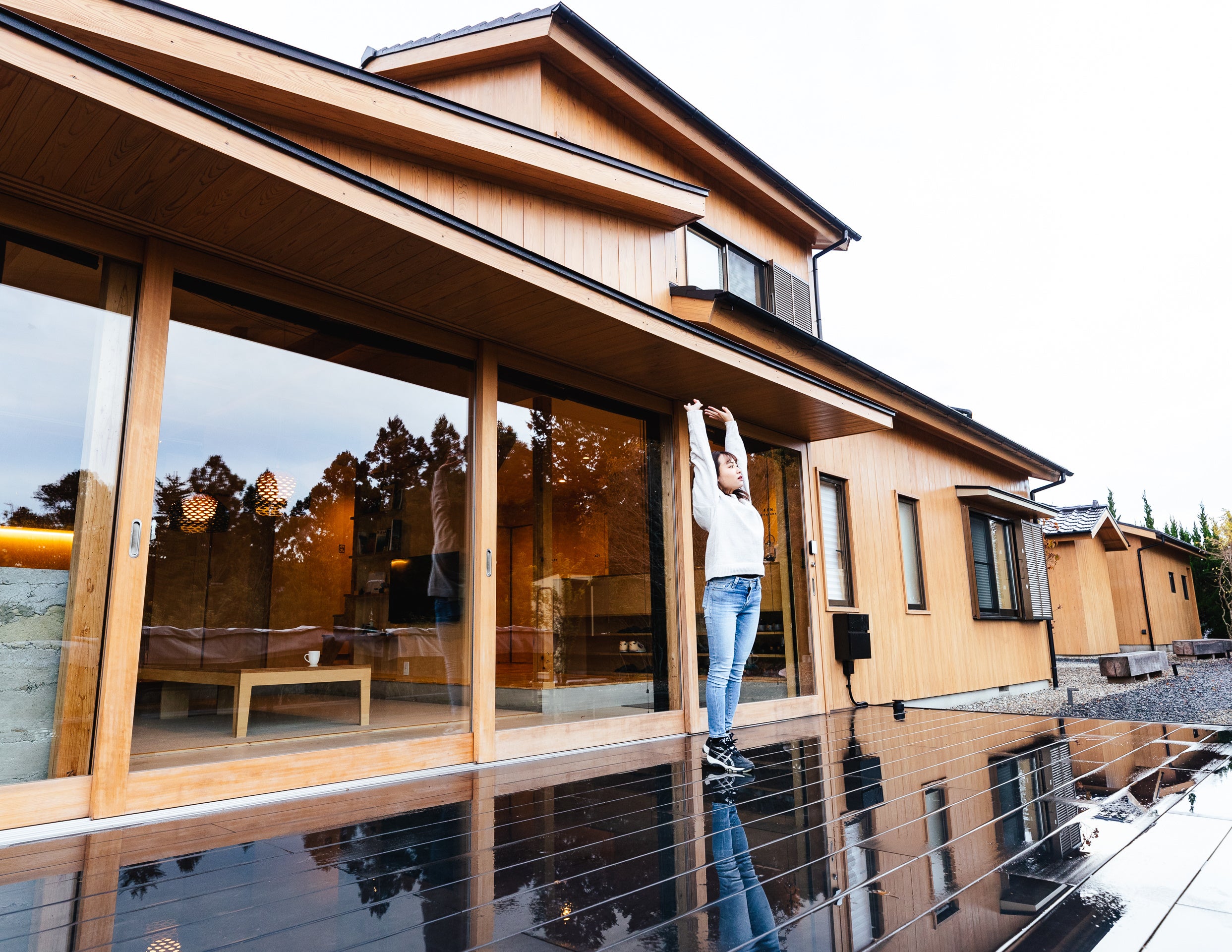 宿泊客が集まることができる広々としたリビングや、ほんのりと木の香りが漂う和室3室を備えています。大自然に囲まれた屋外のデッキテラスでは焚き火を楽しむことができ、夜間には瞬くような星空を、早朝には神秘的な雲海を見ることもできます。