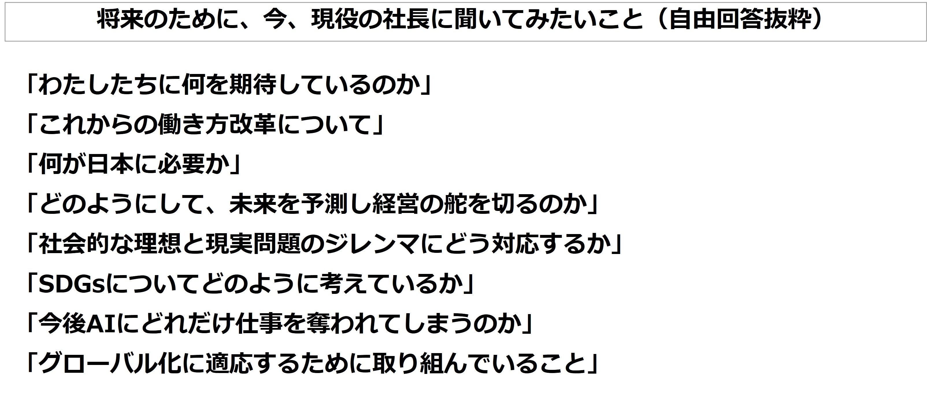 また、将来のために「今、現役社長に聞いてみたいこと」も聞きました。多かった回答には「働き方」「未来をどう予測しているか」などが上がりました。
