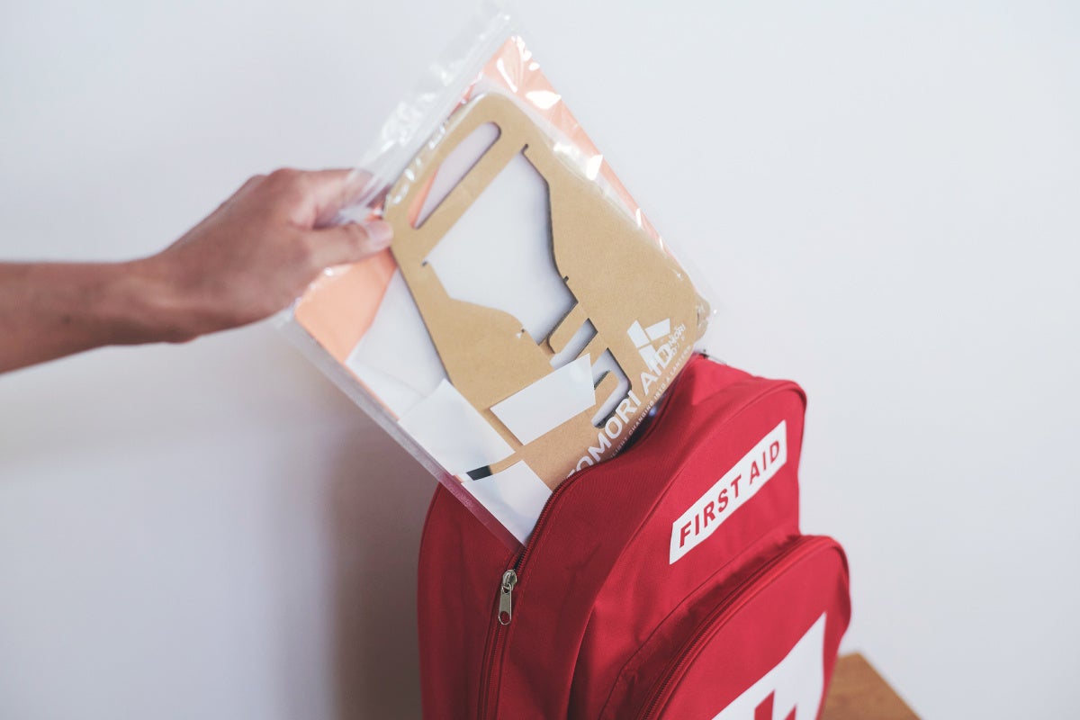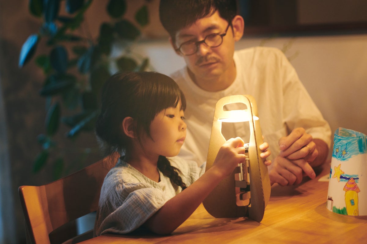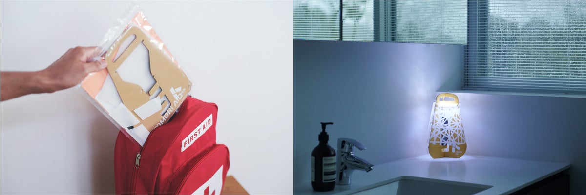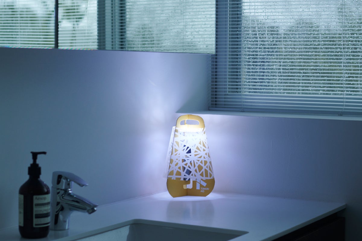 「TOMORI AID(トモリエイド)」はデザイナー自らの避難体験から生まれた、組立てて懐中電灯をいれる事で直線的な光をランタンの様な周囲を照らす光にできる折り畳み式段ボール製照明キットです。「避難時に防災バッグに入れて持ち運べる携帯性」と「飾りたくなるデザイン性」を兼ね備えた、普段使いもいざという時にも役立つあかりです。