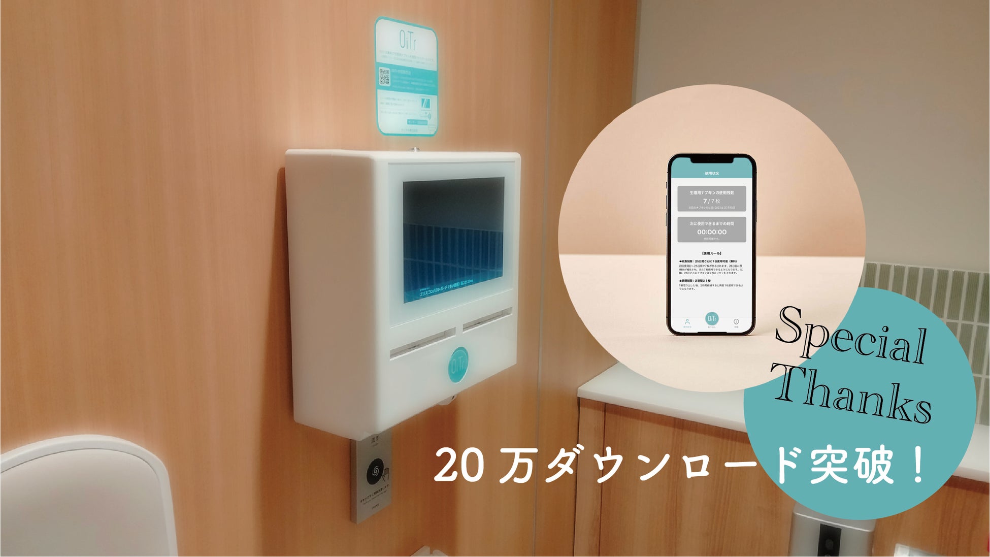 企業・団体などからの広告収益により、商業施設・学校・公共施設・オフィスをはじめとする個室トイレに、生理用ナプキンを常備し無料で提供するサービス「OiTr(オイテル)」を展開するオイテル株式会社(本社:東京都港区、代表取締役社長:小村 大一)は、同サービスの専用アプリ「OiTr」の20万ダウンロードを突破しましたのでお知らせいたします。