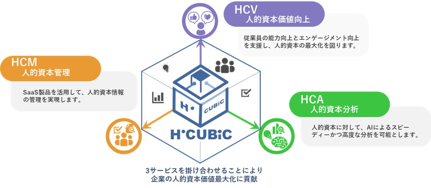 当社は、従来から「多面的発想で社会に貢献する」を企業行動の指針として、お客様に寄り添うサービスを提供してまいりました。H・CUBiCもこの指針に基づいて、お客様の人的資本(Human Capital)経営を多面的に支援するもので、SaaS製品を活用した従業員の「人的資本管理」から、AIを活用した高度な「人的資本分析」、従業員のエンゲージメント向上と従業員の成長を支援する「人的資本価値向上」を掛け合わせることで、大いなるシナジーの実現が期待できます。本サービスにより、企業の人的資本を次のレベルへと引き上げ、お客様の中長期的な企業価値の向上に寄与します。