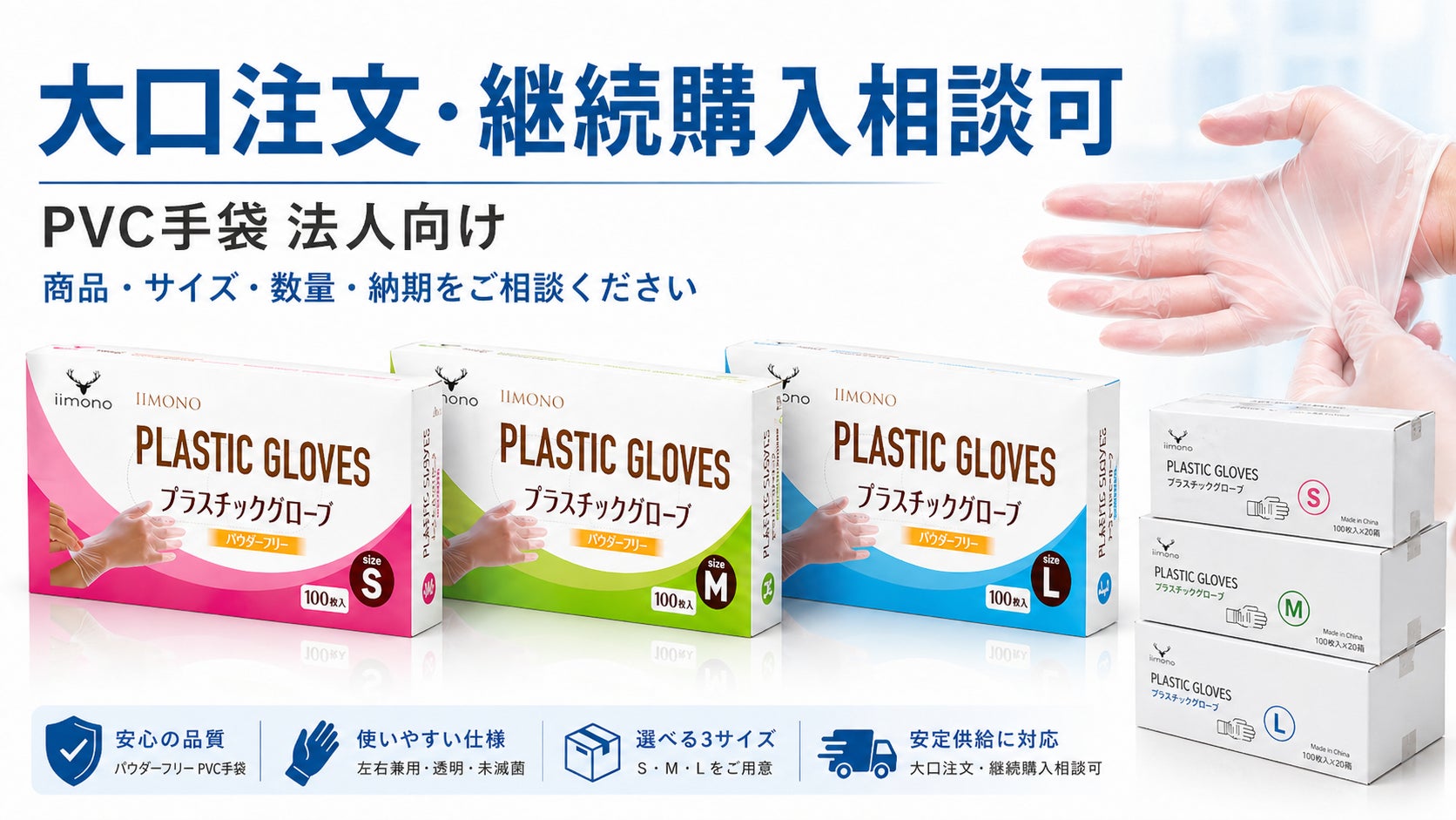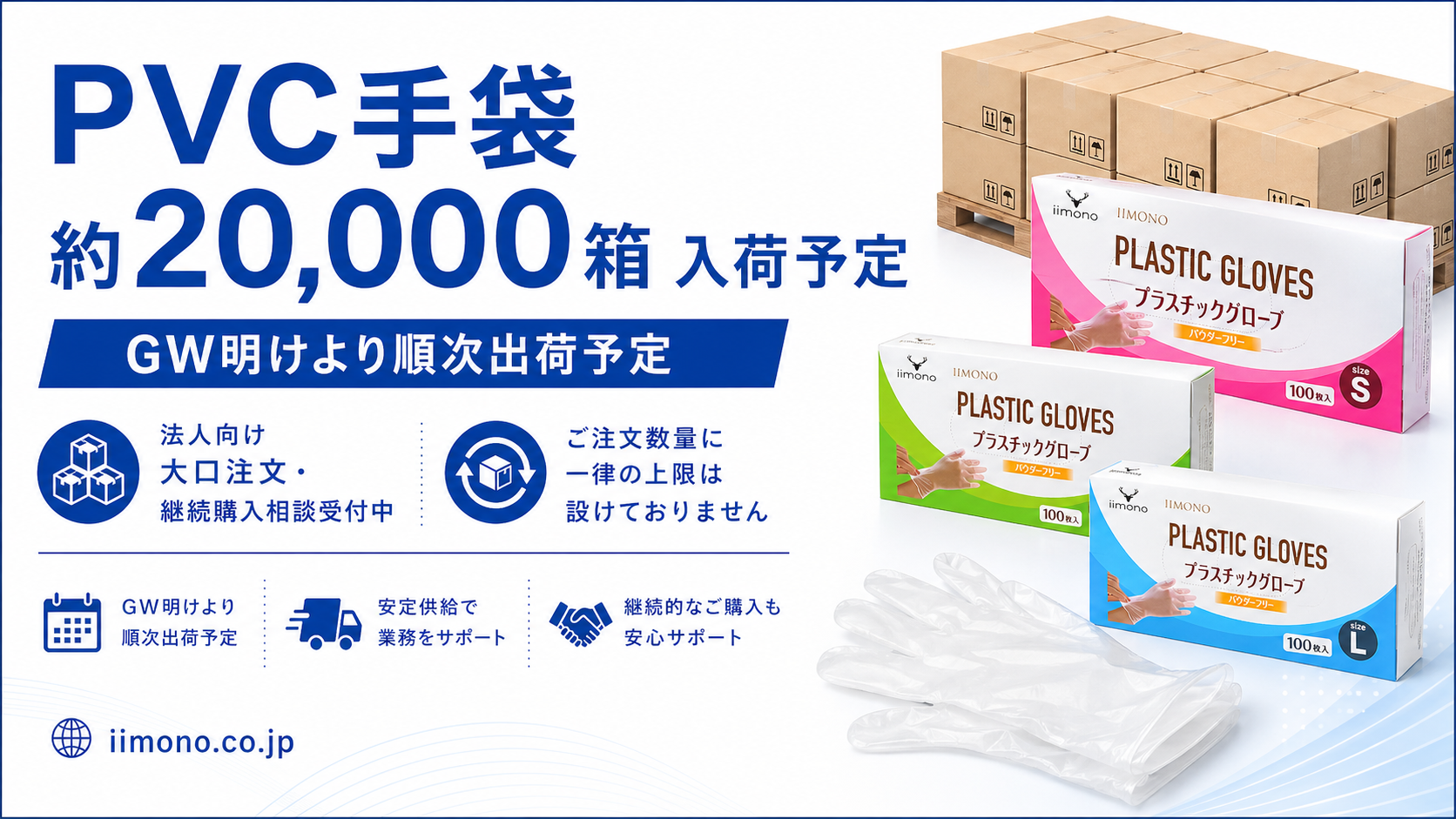 iimono、PVC手袋約20,000箱の入荷を予定。法人向けに大口注文・継続購入相談を受付