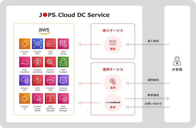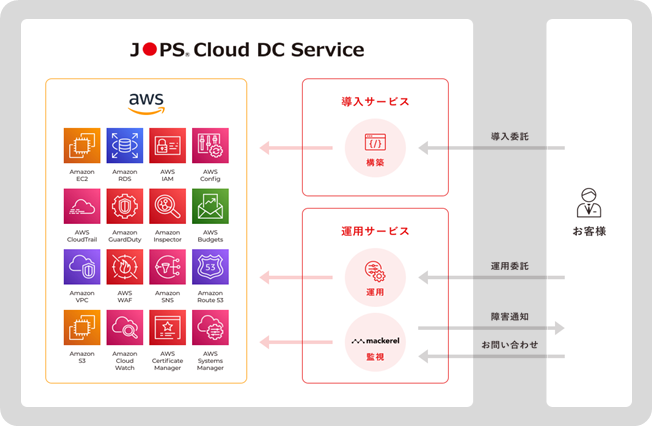 日本オープンシステムズには、設計・運用・セキュリティなど様々な分野のAWS認定資格を有したエンジニアが多数在籍しています。そのため、提案から運用まで全ての工程において豊富な専門知識に基づいた高品質なサービスを提供することが可能です。当社では、AWSインフラおよびサーバー導入支援を行う「導入サービス」や、メンテナンスや設定変更、システム監視、障害対応などを行う「運用サービス」、クラウドの性能を最大限に活かしたCloud Nativeなシステム開発を「JOPS Cloud DC Service」として以下の図のように展開し、お客様のニーズに基づいたワンストップのサービスを通じて、企業の最適なクラウド環境の実現を支援します。
