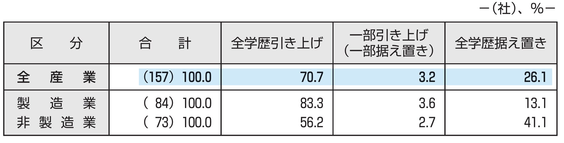 東証プライム上場企業157社の速報集計。「全学歴引き上げ」は70.7%となり、過去10年で最多