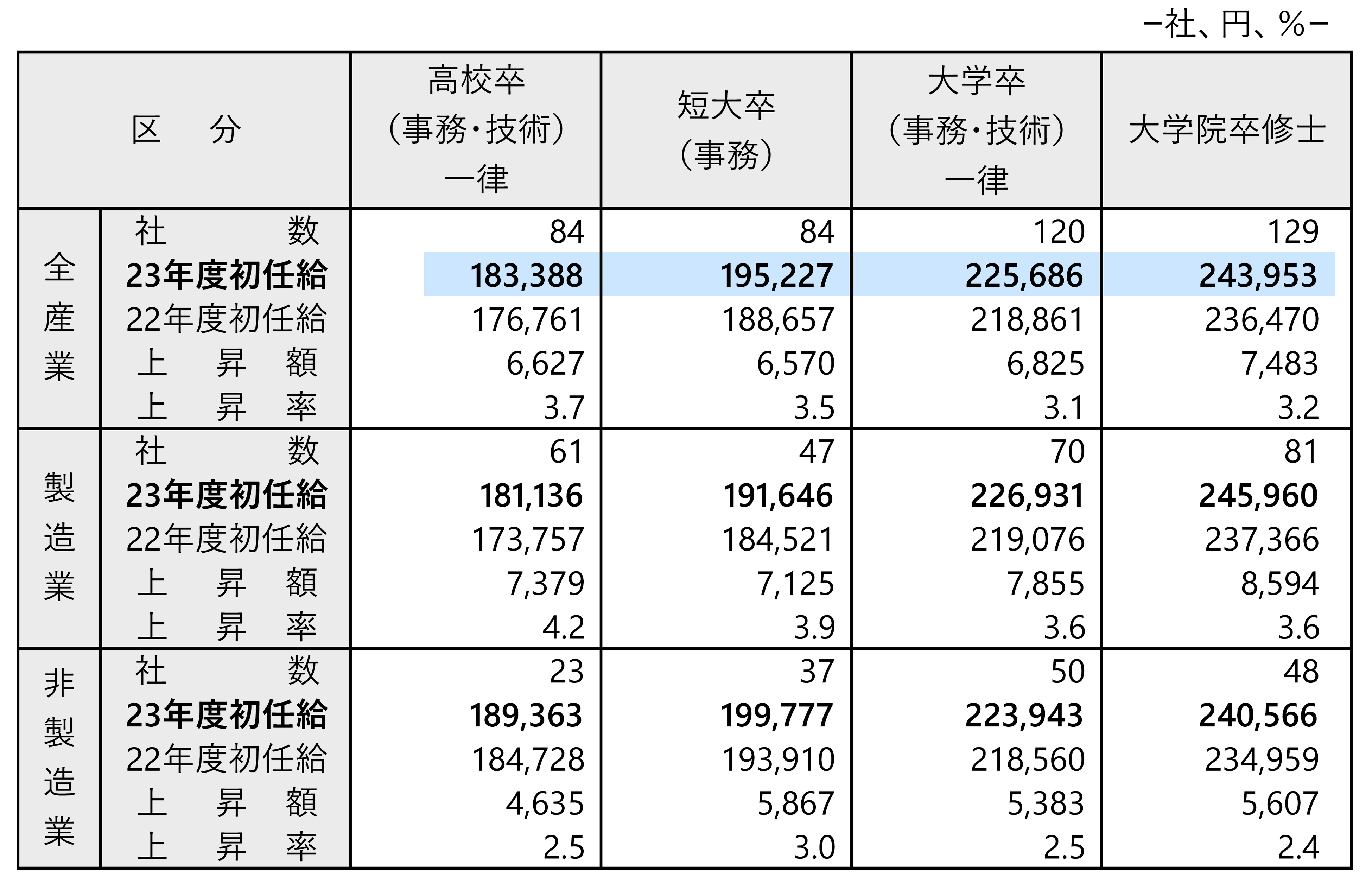 2023年度の賃金見直しによって確定された2023年4月入社者の決定初任給(学歴別)。なお、初任給は原則として時間外手当と通勤手当を除く、諸手当込みの所定内賃金である。