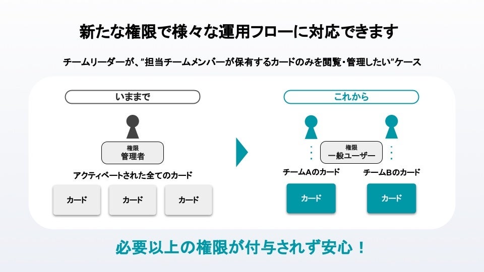 そのため、他のカードの閲覧や利用制限などの管理機能を使用する場合は、全てのカードを管理・閲覧できる「管理者」になる必要があり、必要以上の過大な権限が付与されてしまう場合がありました。