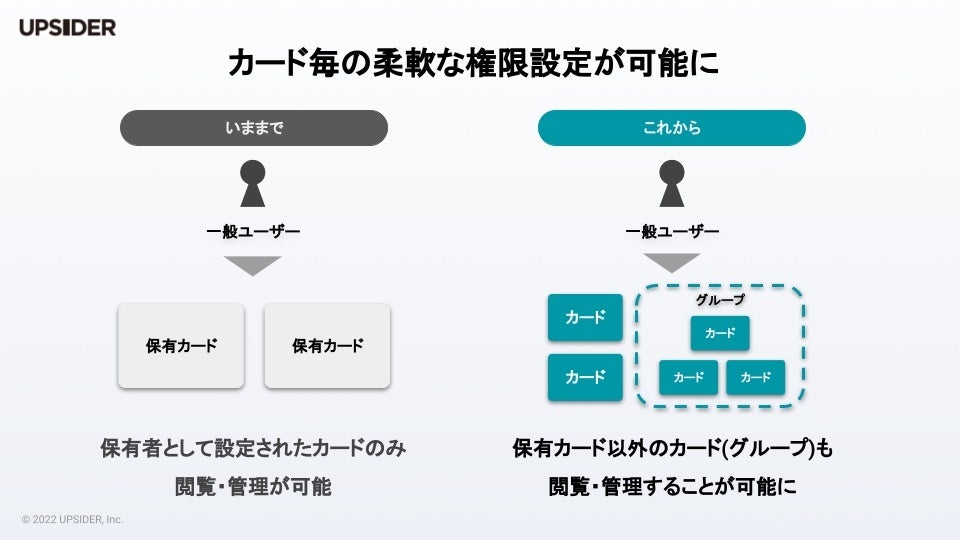 成長企業向けNo.1法人カードを提供する株式会社UPSIDER(代表取締役:宮城徹、本社:東京都港区、以下 当社)は、中〜大規模な組織における複雑なカード運用フローに対応するために、一般ユーザーでもカードごとに管理や閲覧ができるように設定が可能な「カード権限」機能をリリースしました。