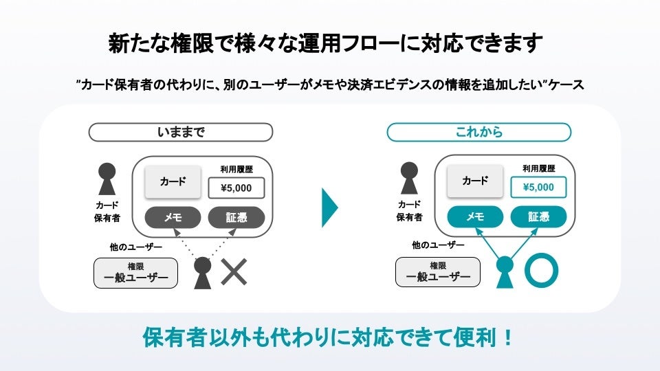 ・カード保有者の代わりに、別のユーザーがメモや決済エビデンスの情報を追加したいケース