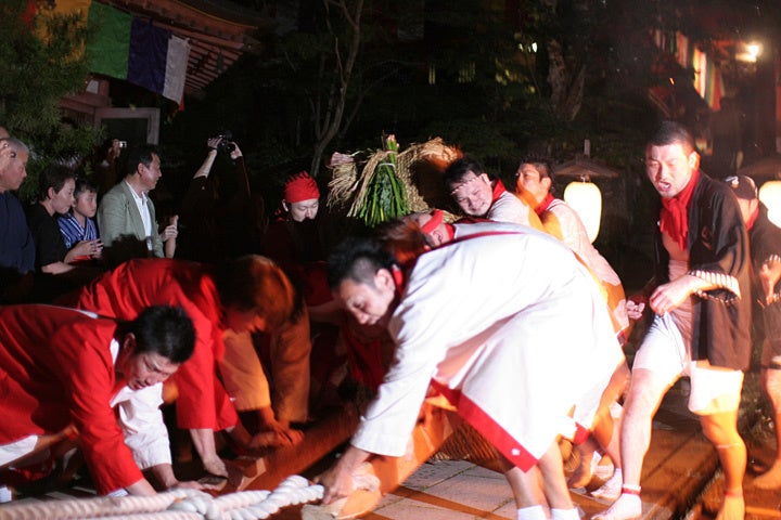 加賀温泉郷の中で、最も盛んに「菖蒲湯まつり」が行われている山代温泉。平安時代後期の僧・明覚によって建てられた「薬王院温泉寺」は、中世の頃に加賀・越前地方における密教の中心道場でした。その温泉寺に修験者が集まり、厄年にあたる若者の厄払いのために菖蒲を刈って、俵に詰め、無事息災を祈願したのがまつりの始まりとされています。菖蒲の詰まった俵を引きずり回して湯に投げ込み、その湯に浸かって邪気をはらったという勇壮な儀式は、現在でも「入湯式」の一場面として残っています。