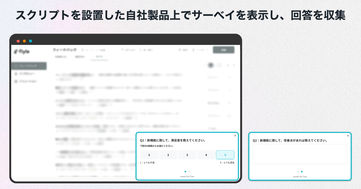 タグマネージャーやスクリプト挿入などで簡単に、自社のプロダクト内にサーベイを表示。スクリプト設置後は、エンジニアの工数をかけずに、エンドユーザーから即座にサーベイを配信することができます。