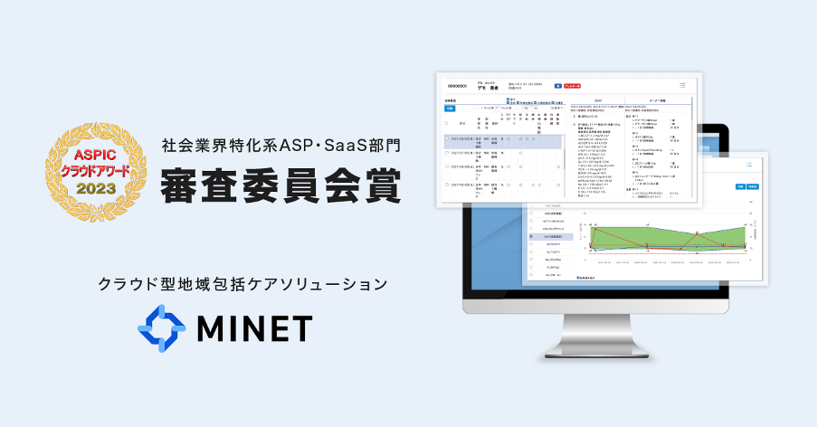 クラウド型地域包括ケアソリューション「MINET」、総務省後援「ASPIC クラウドアワード2023」において「社会業界特化系ASP・SaaS部門 審査委員会賞」を受賞