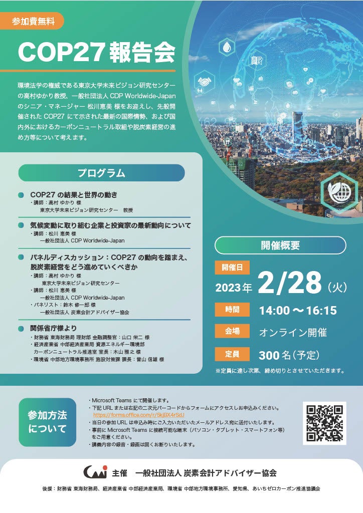 <炭素会計アドバイザー協会> 2023年2月28日「COP27報告会」を開催します