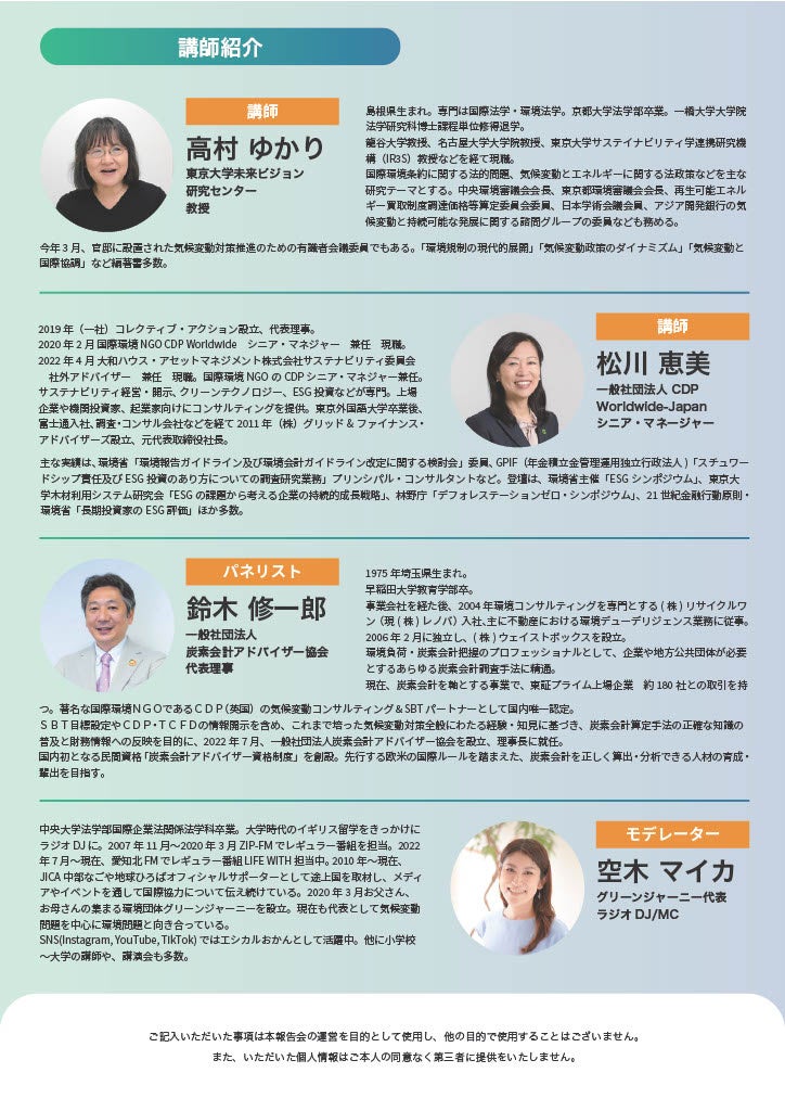 環境法学の権威である東京大学未来ビジョン研究センターの高村ゆかり教授、一般社団法人CDP Worldwide-Japanのシニア・マネージャー 松川恵美 様をお迎えし、先般開催されたCOP27にて示された最新の国際情勢、および国内外におけるカーボンニュートラル取組や脱炭素経営の進め方等について考えます。