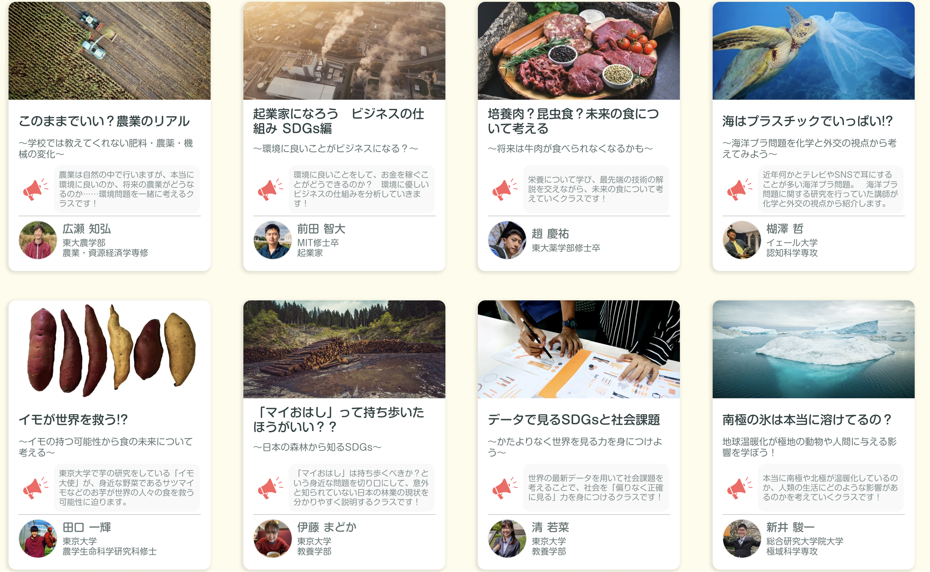 「~学校では教えてくれない肥料・農薬・機械の変化~ このままでいい?農業のリアル」や「~海洋プラ問題を化学と外交の視点から考えてみよう~ 海はプラスチックでいっぱい?」などのクラスを開講中