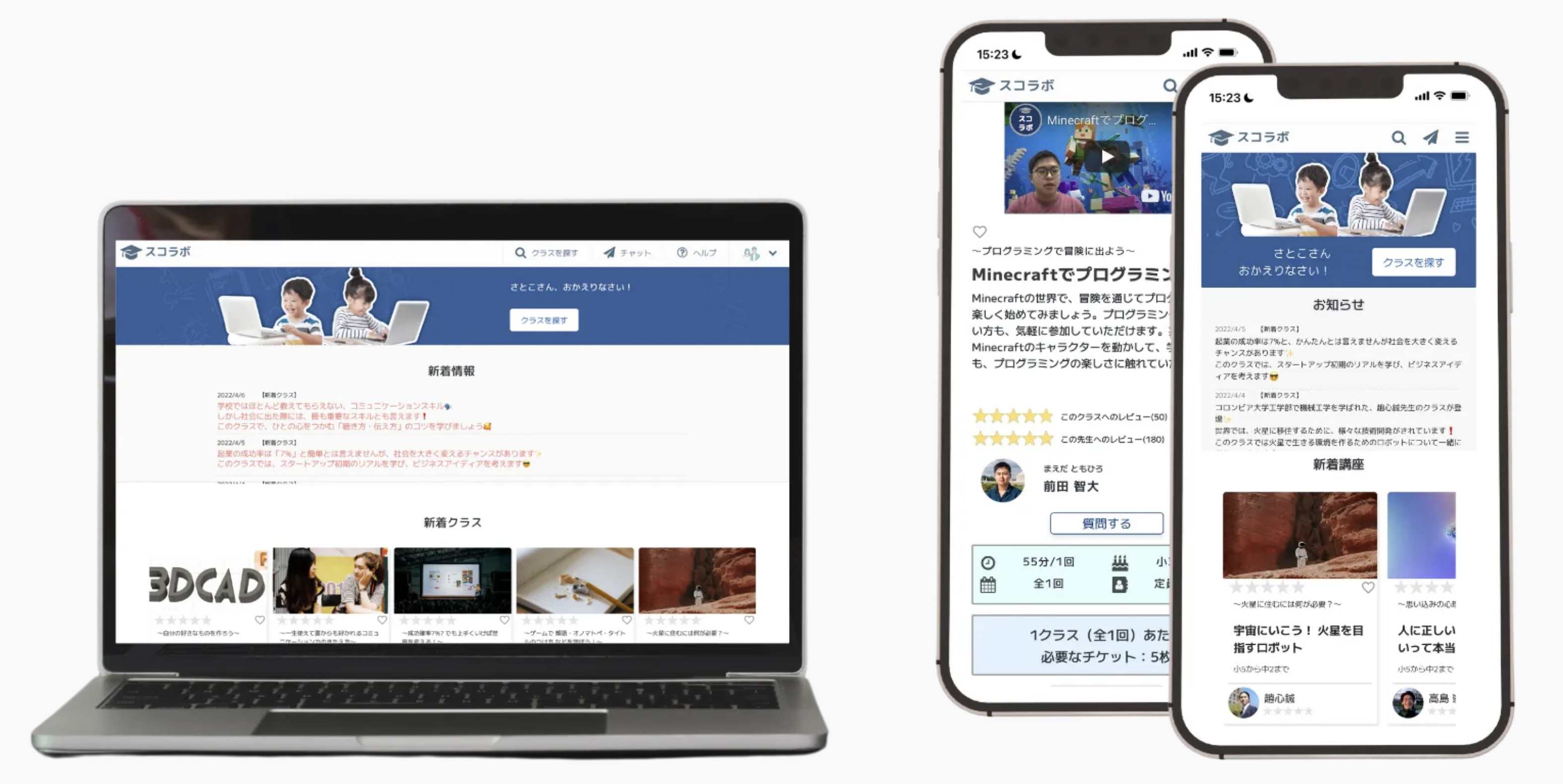 「スコラボ」は家にいながら、先生や友達と対話を通じて学ぶことができる少人数制・オンラインライブ授業を受けるためのプラットフォームです。現在60人以上の先生が、170以上のユニークなクラスを開催しています。子供が自分の興味を見つけて、将来、社会に参画していくにあたり、さまざまな能力の形成の一助となる授業をオンラインライブ形式で展開しています。1回完結のクラスが980円から受講していただけます。