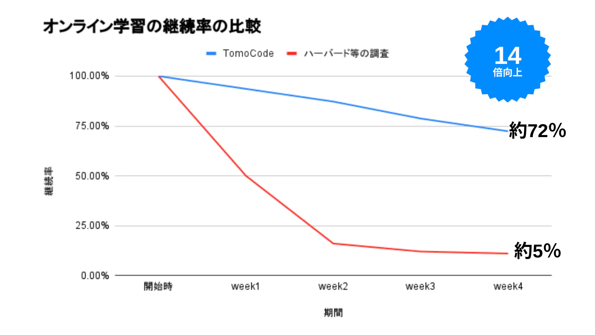 ハーバード大学等によるオンライン学習(Moocs等)の継続率調査と現在までのTomoCodeの継続率を比較すると、TomoCodeのプログラムは終了時点で約14倍以上の継続率となっており、非常に熱のある学習プラットフォームとなっております。