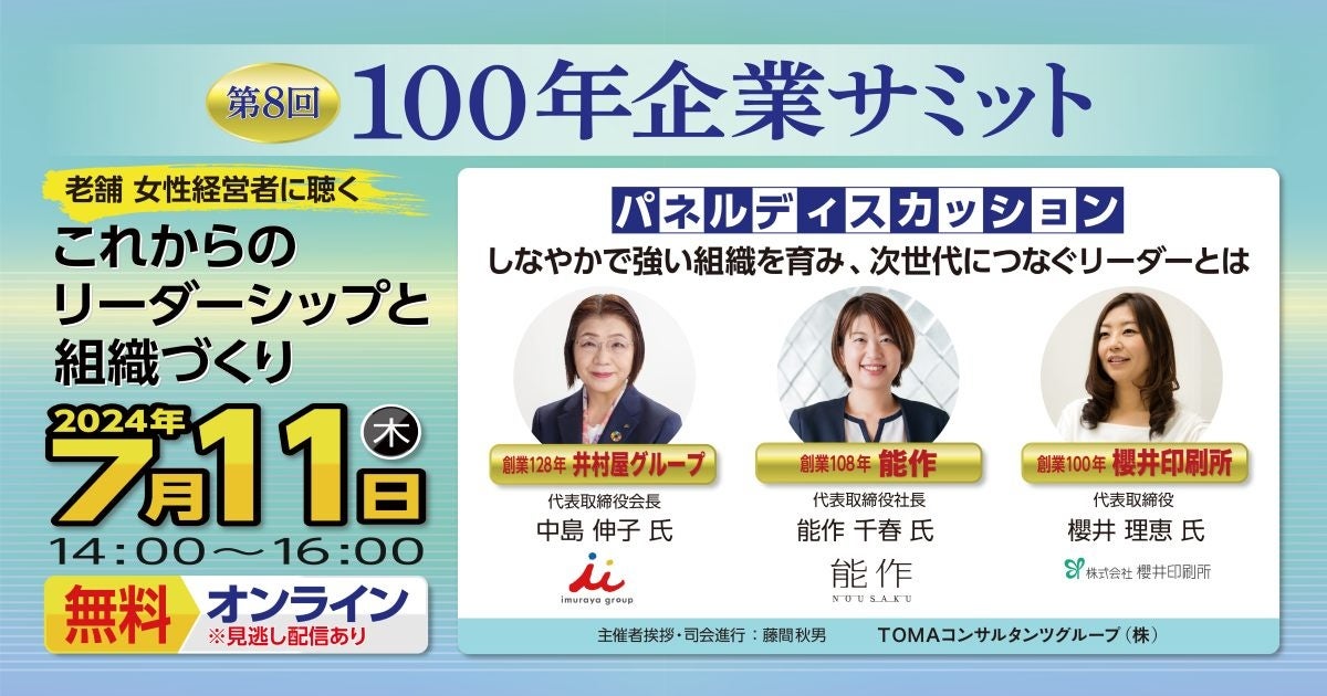 TOMAコンサルタンツグループ(所在地:東京都千代田区、グループ代表:市原 和洋)は2024年7月11日、『100年企業サミット 老舗 女性経営者に聴く、これからのリーダーシップと組織づくり』~しなやかで強い組織を育み、次世代につなぐリーダーとは~(オンライン・参加費無料)を開催します。第8回を迎える本サミットでは、井村屋グループ(創業128年)、能作(創業108年)、櫻井印刷所(創業100年)の100年企業3社の老舗企業の女性経営者3名をお迎えし、これからのリーダーシップと組織づくりについてのパネルディスカッションを行います。