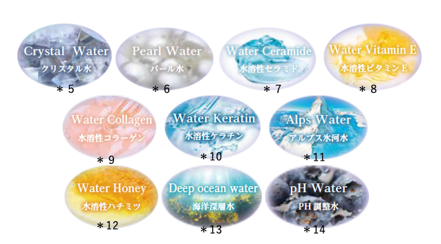 *1 ケイ酸Na (保湿・保護) 、イソステアロイル加水分解シルク(保湿・ツヤ) *2ケイ酸Na、加水分解コンキオリン、グルコシルセラミド、トコフェリルリン酸Na、水溶性コラーゲン、水溶性ケラチン(羊毛)、加水分解ハチミツタンパク、ビルベリー果実エキス(全て保湿・保護)、水、海水(全て保湿) *3ジラウロイルグルタミン酸リシンNa(保湿・保護) *4クエン酸(pH調整剤)、ビルベリー果実エキス(保湿・保護)、トコフェリルリン酸Na(保湿・保護)*5ケイ酸Na(保湿・保護) *6加水分解コンキオリン(保湿・保護) *7グルコシルセラミド(保湿・保護) *8トコフェリルリン酸Na(保湿・保護) *9水溶性コラーゲン(保湿・保護)*10水溶性ケラチン(羊毛)(保湿・保護) *11水(アルプス氷河水)(保湿) *12加水分解ハチミツタンパク(保湿・保護) *13海水(保湿) *14ビルベリー果実エキス(保湿・保護)