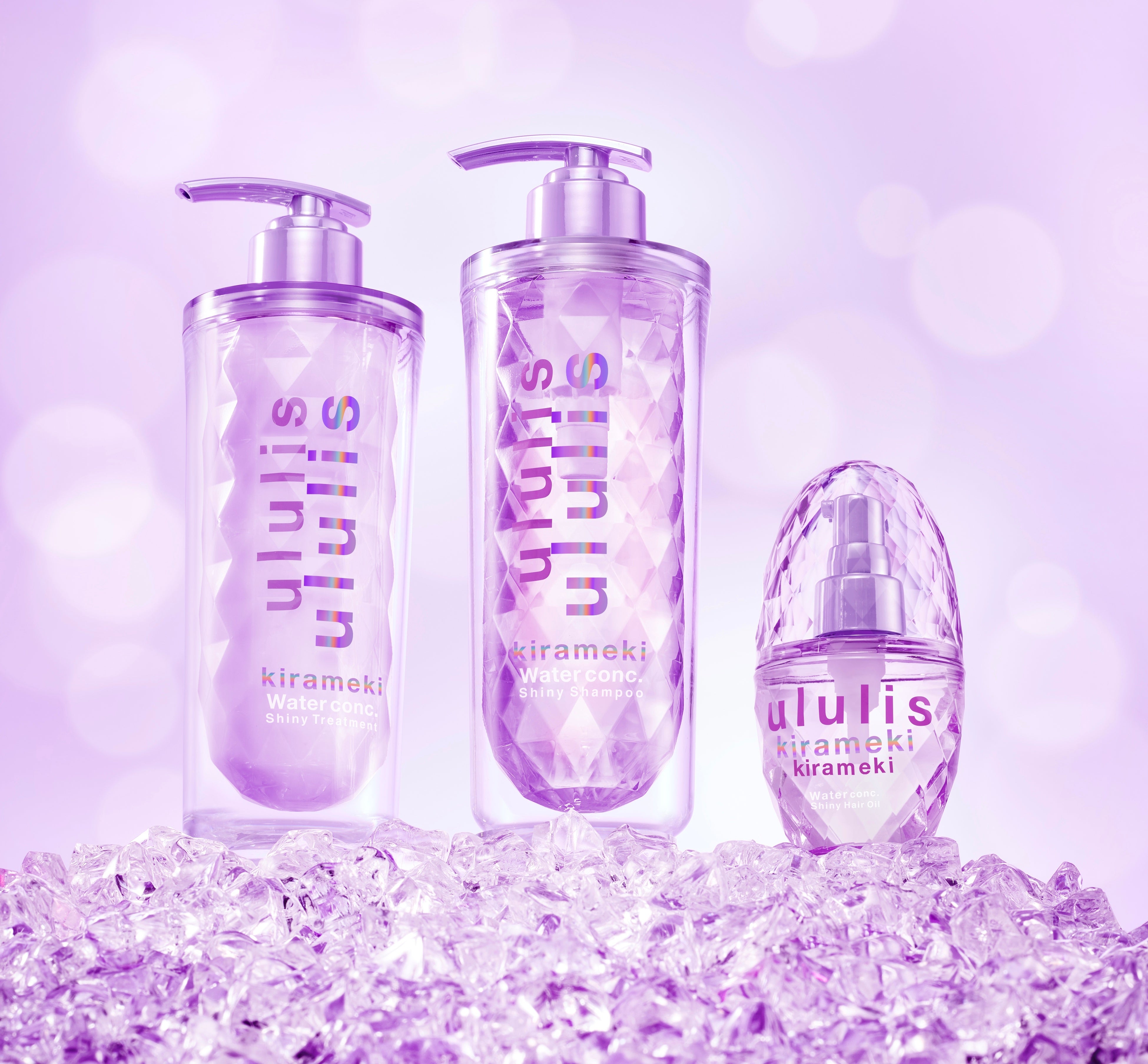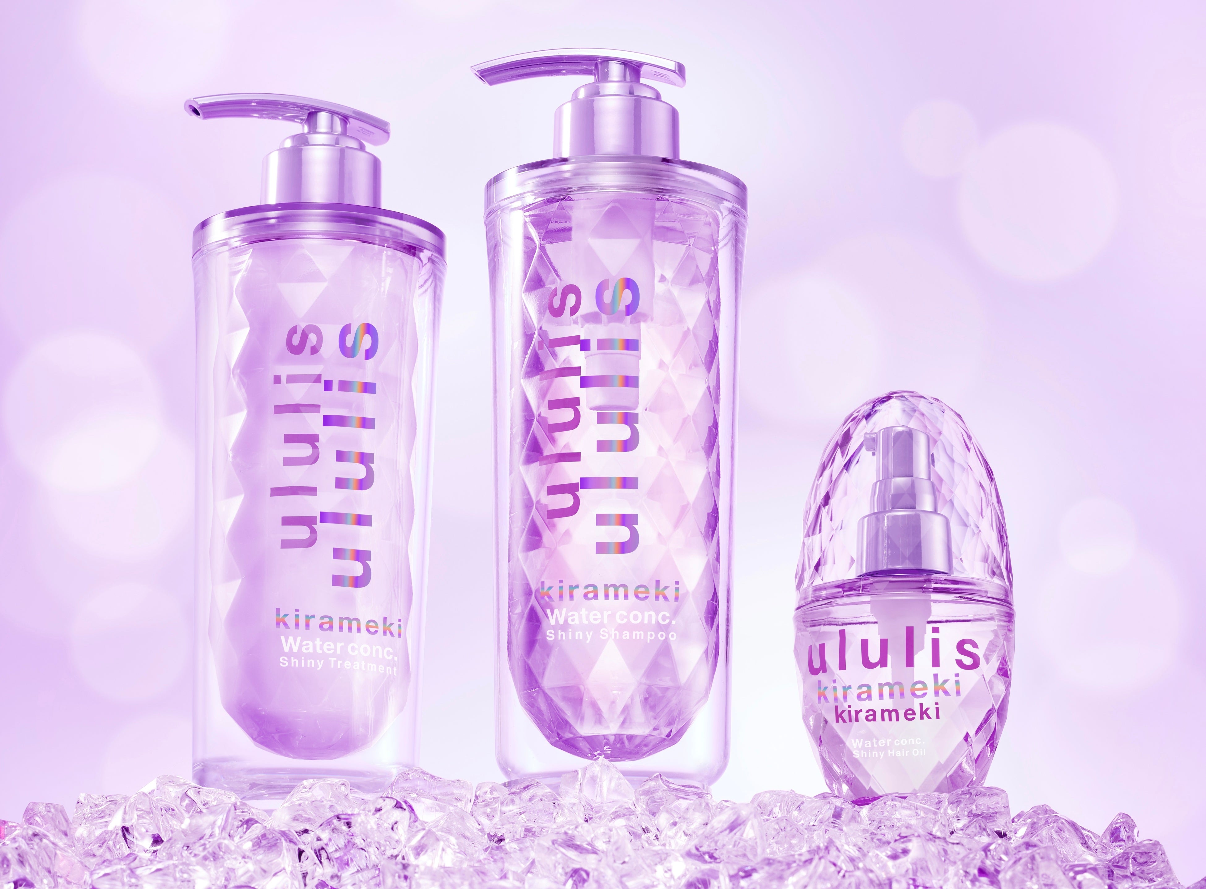 今回発売する『ululis kirameki』は、90%以上が補水+輝光成分※2で構成されており、髪のpH・水分バランスを整える“水光ウォーターパック美容メカニズム”により水光度※3 120%※4のうるおいあるキラツヤ髪に導きます。また、世界初※5の二重構造ボトルを採用しており、ダイヤモンドカットのキラキラボトルで特別感のあるラグジュアリーなバスタイムをお楽しみいただけます。