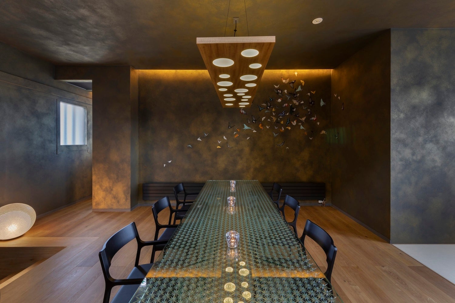インテリアの基調は、桃山時代の後期に興ったデザイン性の高い「琳派」をイメージし、琳派の画家で蝶を中心に生態系を描く九州出身の小松孝英氏が描き下ろした蝶や桜の壁画を中心としたデザインとなっています。