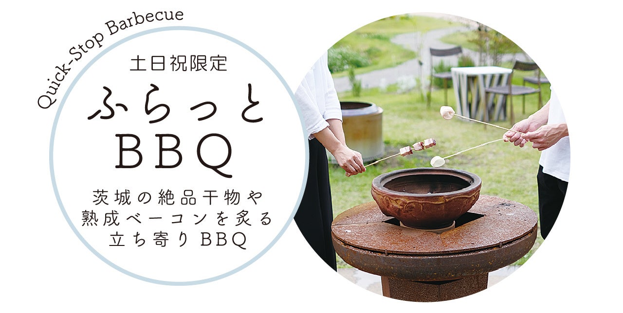 茨城の絶品干物や熟成ベーコン、焼きとうもろこし、マシュマロなど、手軽に立ち寄って炙れる「ふらっとBBQ」をレストランのテラスにて休日限定で開催。