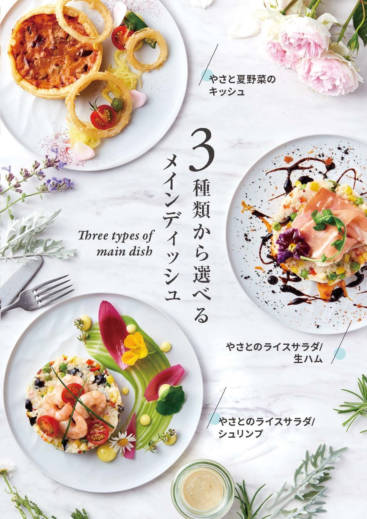 やさと産のお米と夏野菜を使ったはスペイン産の生ハムと小エビのマリネの2種類をご用意。ほんのりカレー風味、夏野菜をふんだんに使ったトマトベースのキッシュも登場。