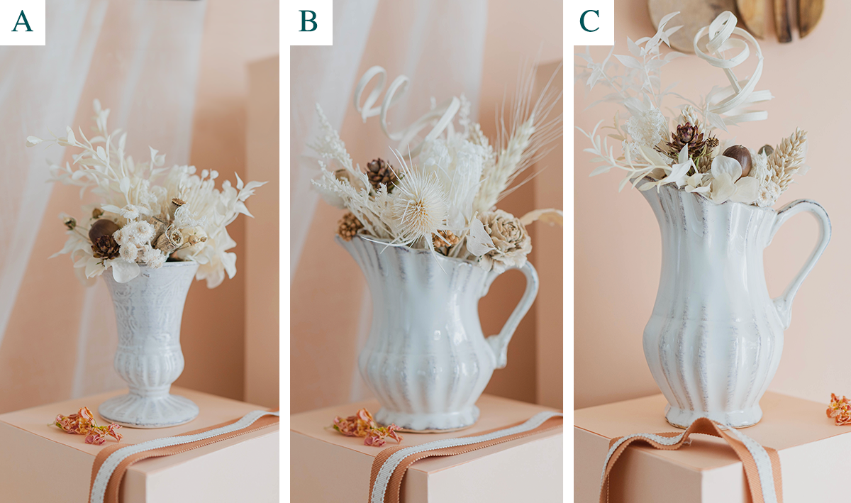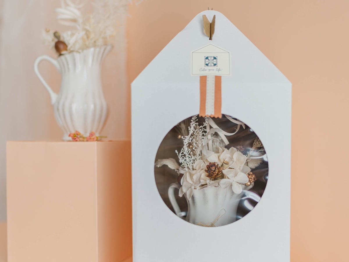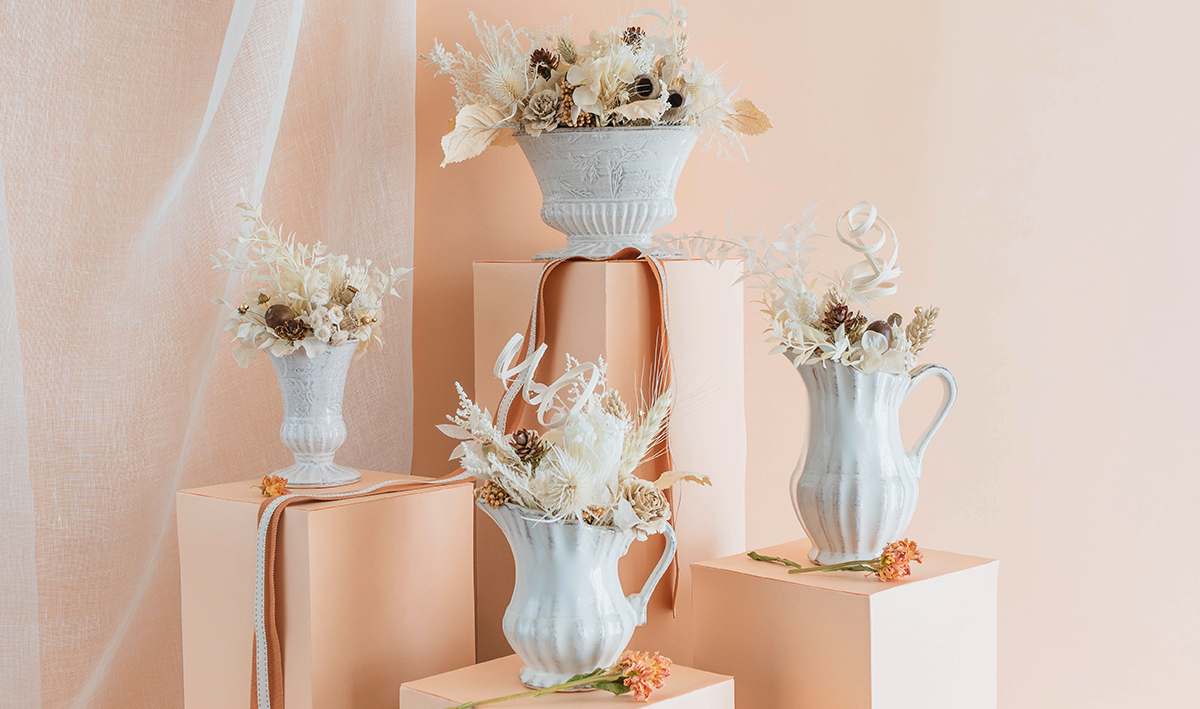 ミルクピッチャーに入ったアレンジを中心に、キッチンや食卓にぴったりなアイテムとなっています。