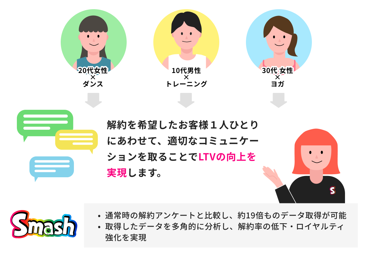当社のリテンションボット「Smash」を活用し、解約というタッチポイントからユーザーとのコミュニケーションを通じて、解約抑止に役立つ様々な情報を集めることが可能になりユーザーとのコミュニケーションの中で様々なデータ取得・分析を瞬時に行い、コミュニケーションに反映することで、ユーザーのロイヤルティ強化に繋がり、しいては解約抑止率の向上に貢献します。