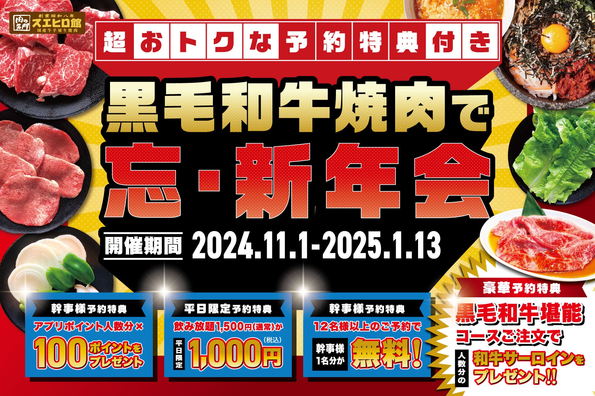 【焼肉スエヒロ館】事前予約で黒毛和牛サーロインがもらえる超おトクな特典もある『黒毛和牛焼肉で忘・新年会』コースの予約スタート!!