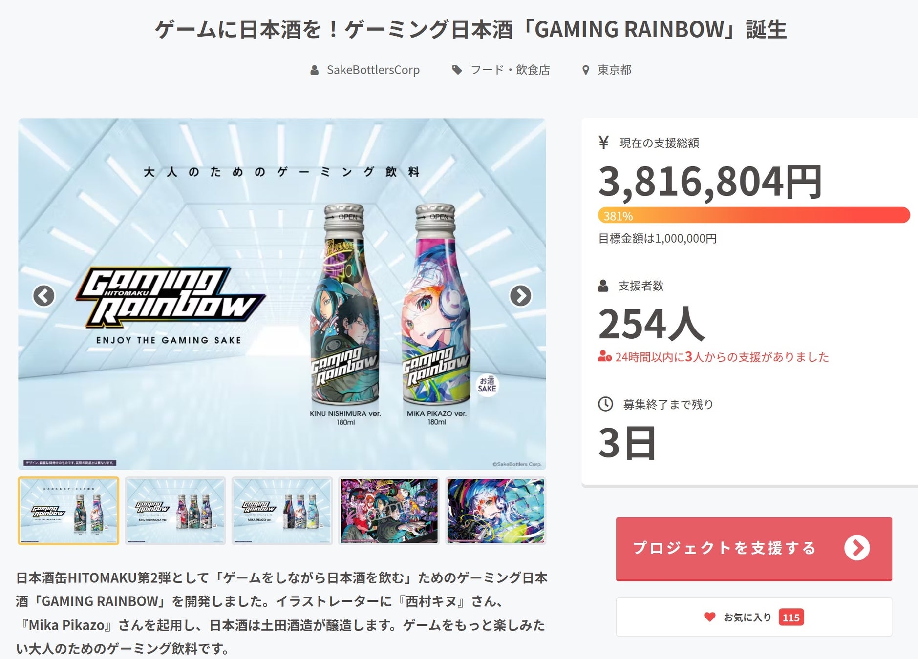開始3時間で目標額100万円、4日間で200万円を達成しました。