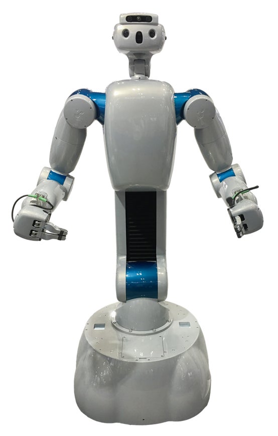 腕7軸×2本、腰3軸(ヨー・ピッチ・昇降)、首2軸(ヨー・ピッチ)、足回り4軸(全方位移動台車)の関節構成により、人間の作業空間において人に近い可動域で作業ができます。上半身のみの販売も行っております。