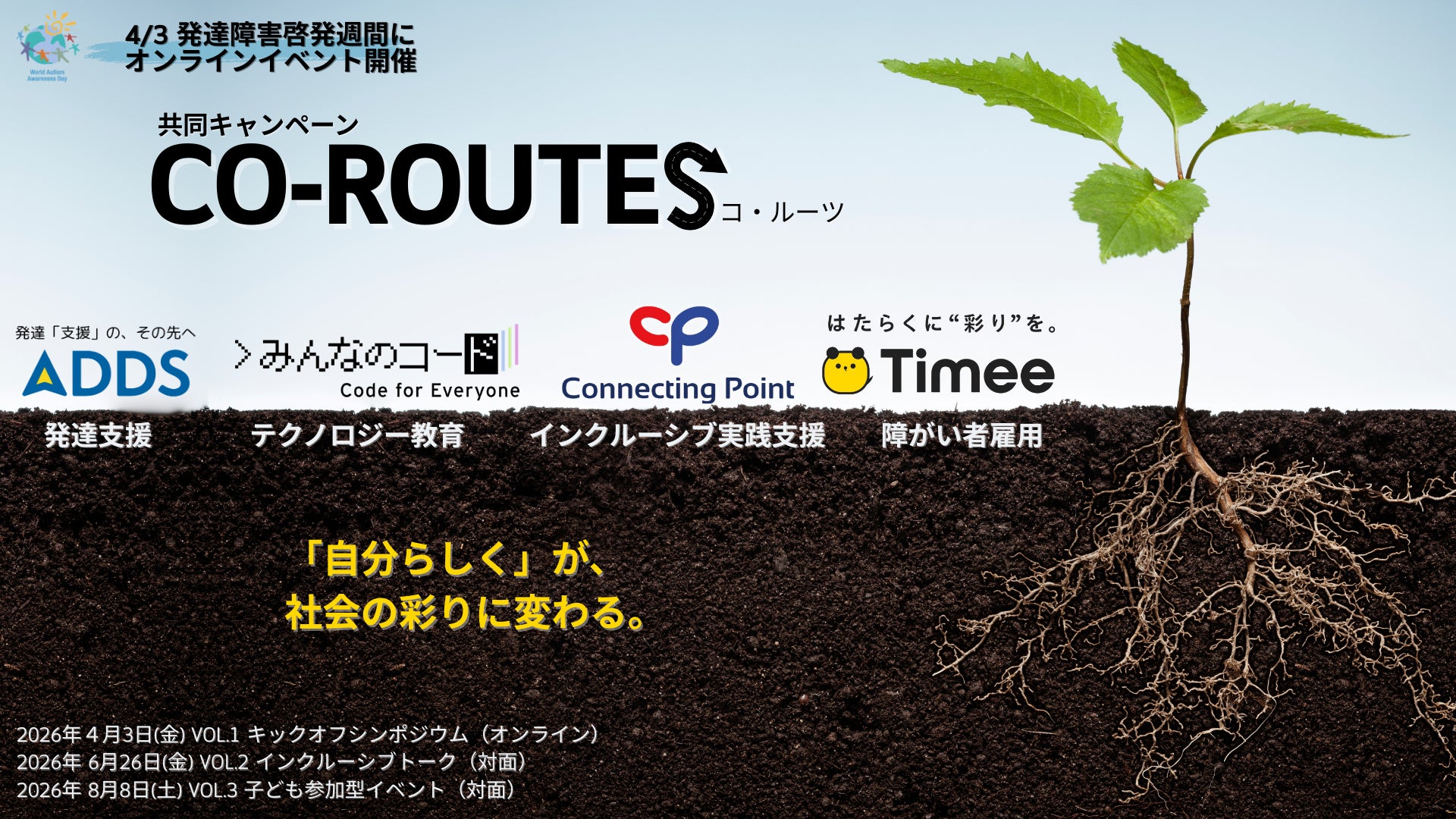 NPO法人ADDS(所在地:東京都杉並区、共同代表:熊仁美・竹内弓乃)は、株式会社Connecting Point、株式会社タイミー、NPO法人みんなのコードの3団体と、障害の有無に関わらず、一人ひとりが「自分らしく」をあきらめずに社会と繋がるための『CO-ROUTES(コ・ルーツ)』キャンペーンを2026年度に共同で実施します。