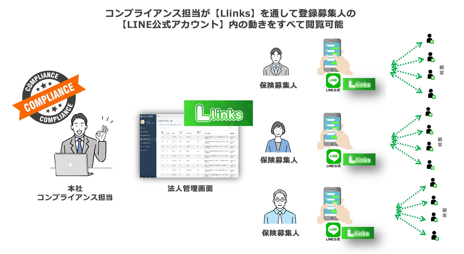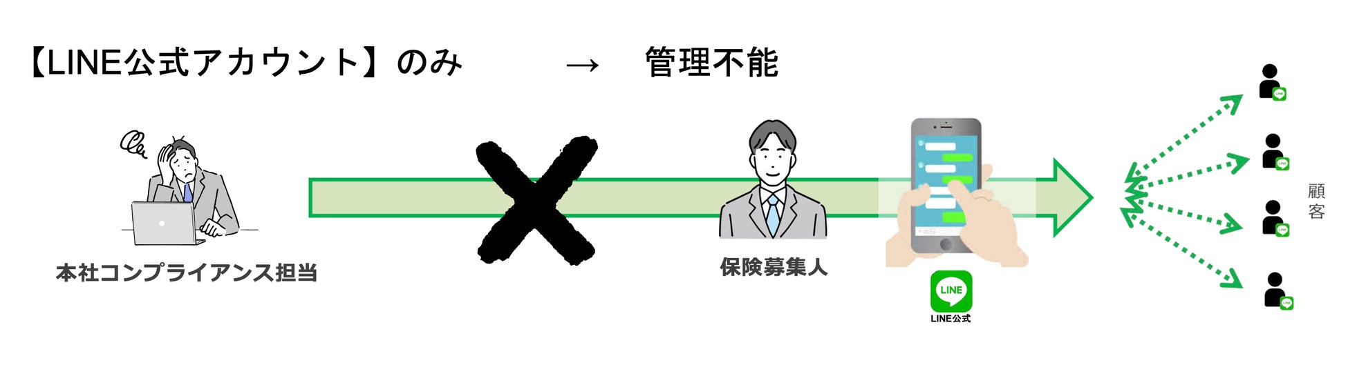 これまで保険業界では、一部の保険募集人が独自に【LINE公式アカウント】を開設し、企業(保険代理店)として管理が行き届かないまま募集活動を行うケースが見受けられ、企業全体で統制の取れた管理運用を実現することが困難な状況が続いていました。