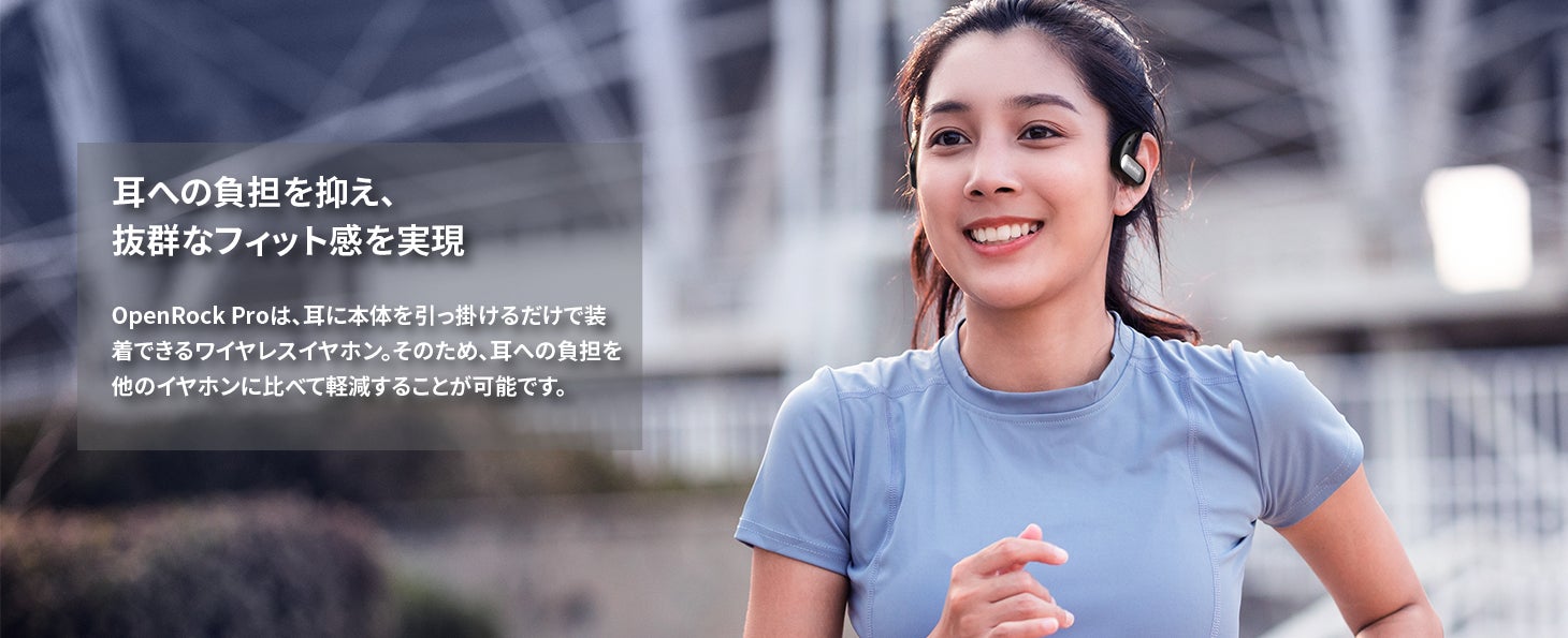 OpenRock Proは耳をふさがない「オープンイヤー型」の完全ワイヤレスイヤホンです。従来のイヤーピースを耳に入れるイヤホンと異なり、耳の穴を塞がないで音を届けるため圧迫感や閉塞感なく快適な装着感を実現した製品です。周囲の環境音も聞き取りやすいため、ランニングやジョギングといったスポーツの際にも最適なワイヤレスイヤホンです。