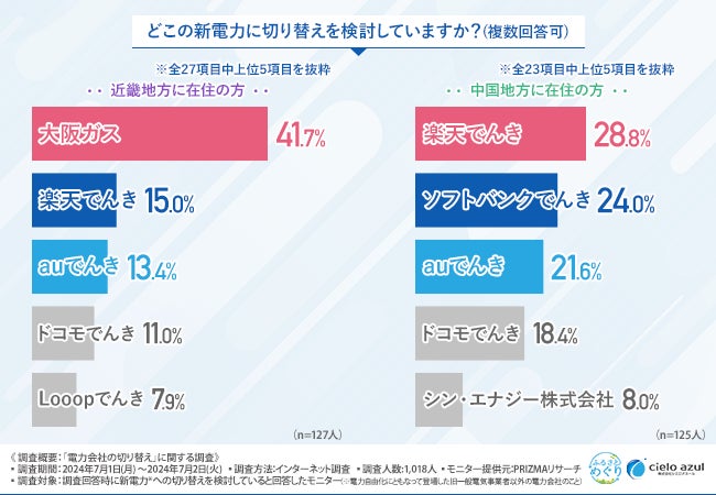 近畿地方在住の方に「どこの新電力に切り替えを検討していますか?(複数回答可)」と質問したところ、『大阪ガス(41.7%)』と回答した方が最も多く、次いで『楽天でんき(15.0%)』『auでんき(13.4%)』となりました。
