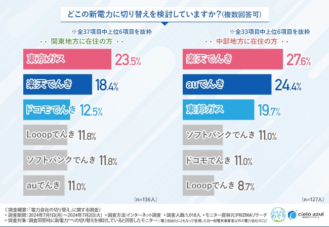関東地方在住の方に「どこの新電力に切り替えを検討していますか?(複数回答可)」と質問したところ、『東京ガス(23.5%)』と回答した方が最も多く、次いで『楽天でんき(18.4%)』『ドコモでんき(12.5%)』となりました。