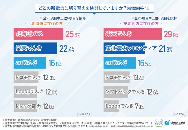 はじめに、北海道在住の方に「どこの新電力に切り替えを検討していますか?(複数回答可)」と質問したところ、『北海道ガス(25.6%)』と回答した方が最も多く、次いで『楽天でんき(22.4%)』『auでんき(16.8%)』となりました。